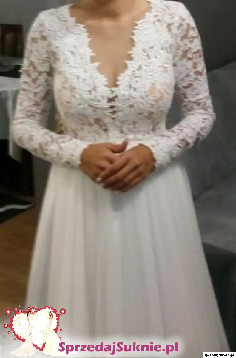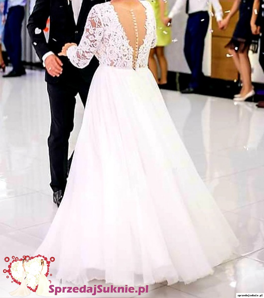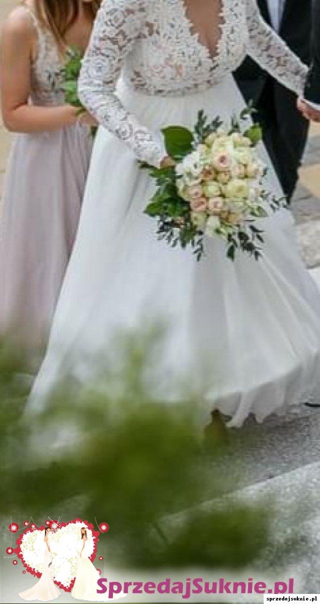 Suknia ślubna Aurelia przerobione pod upodobania panny młodej. Pod biustem doczepiony pasek z koralików. Góra koronkowa z dekoltem w litera V. Bardzo ładnie prezentuje się przy obkrecaniu. Wszyte miseczki. Na plecach guziczki