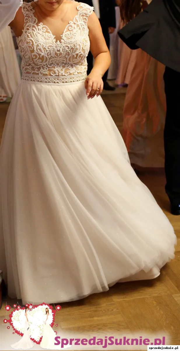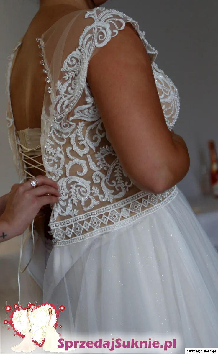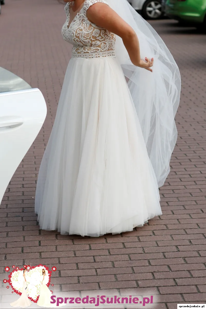 Dół jest z tiulu, ma kilka warstw, z czego przedostatnia jest z dodatkiem brokatu. Sprawia to, że dół pięknie się mieni, czego w pełni nie widać na zdjęciach. Dół sukni jest w kolorze ecru/jasny beż.