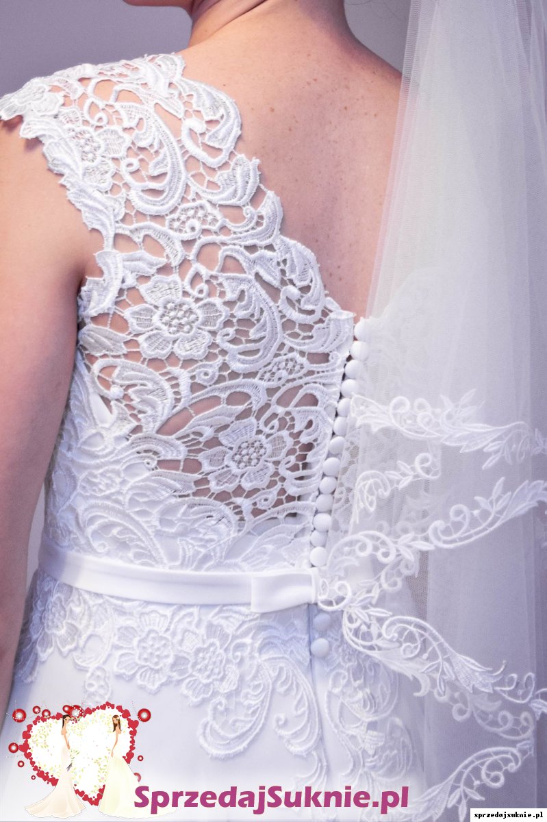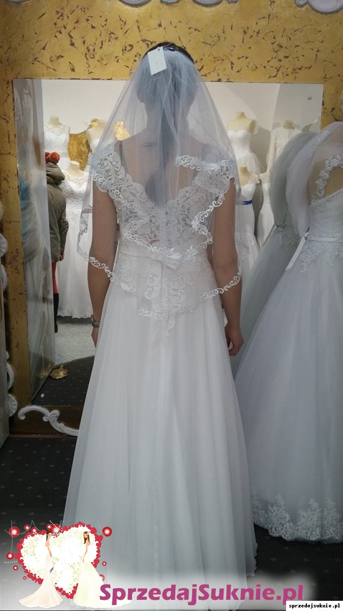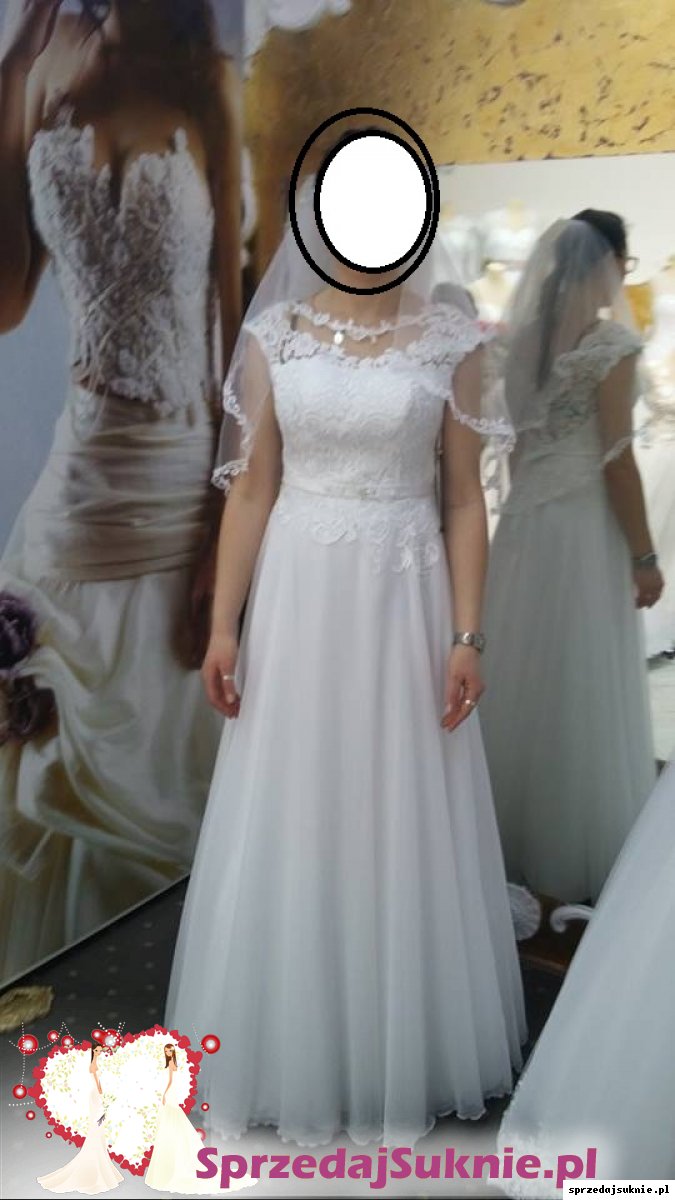 Sprzedam suknię ślubną widoczną na zdjęciu. Suknia zakupiona w salonie mody ślubnej Erica.Dolna część sukni wykonana jest z muślinu . Suknia biała, posiada doszytą halkę, do której można wstawić koło ( u mnie była bez koła). Do sukni dołączony jest pasek podkreślający talię oraz welon.
