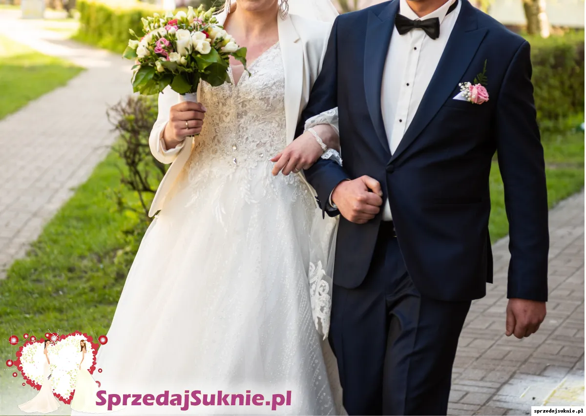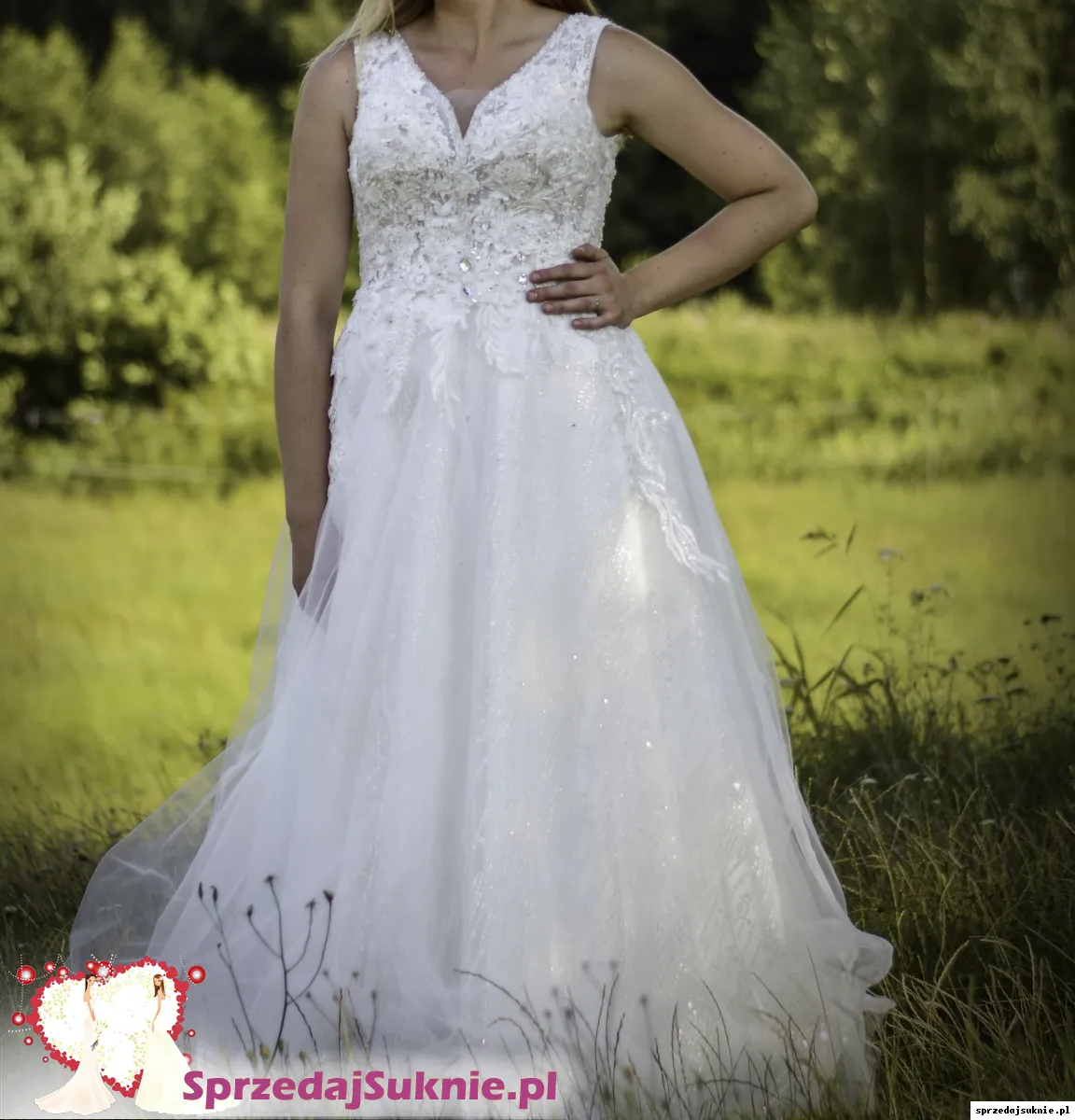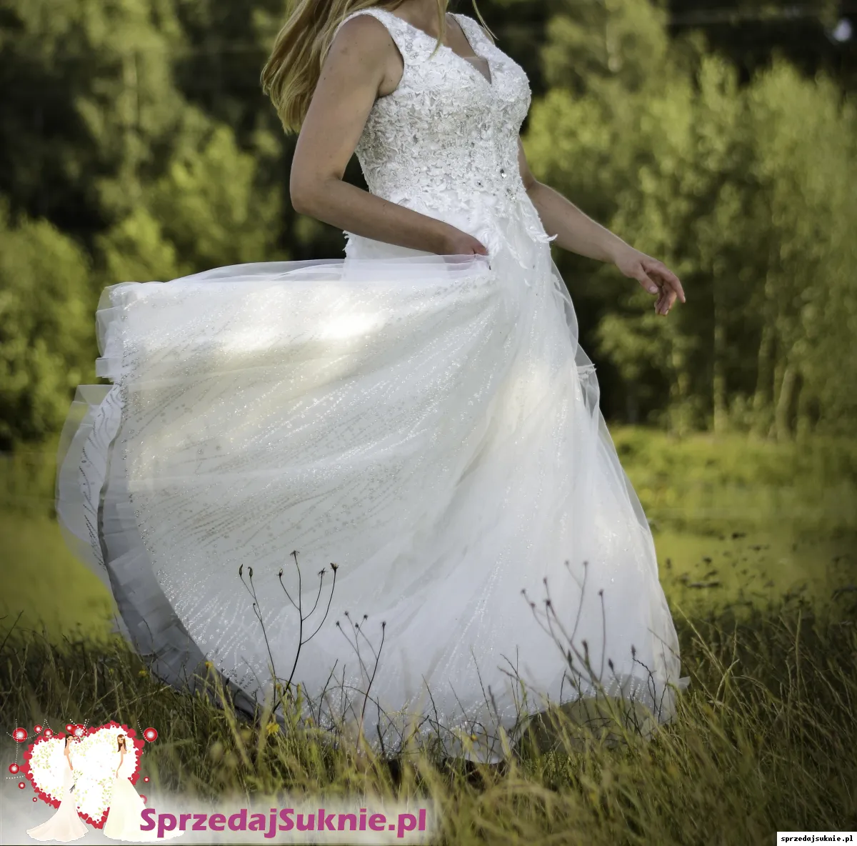 Sprzedam suknię ślubną szytą na wzrost 173cm + 7cm. Suknia posiada 5 warstw tiulu w tym jedna warstwa z pięknym wzorem z brokatem. W komplecie posiadam halkę na kole która pięknie prezentuje suknię w tańcu oraz dwa welony krótki i długi.