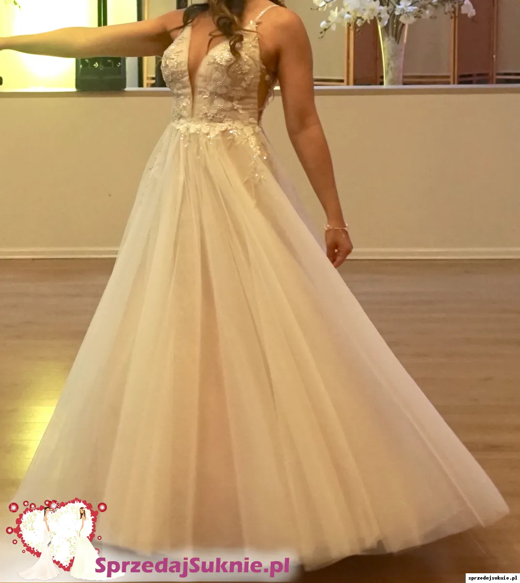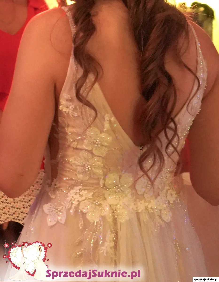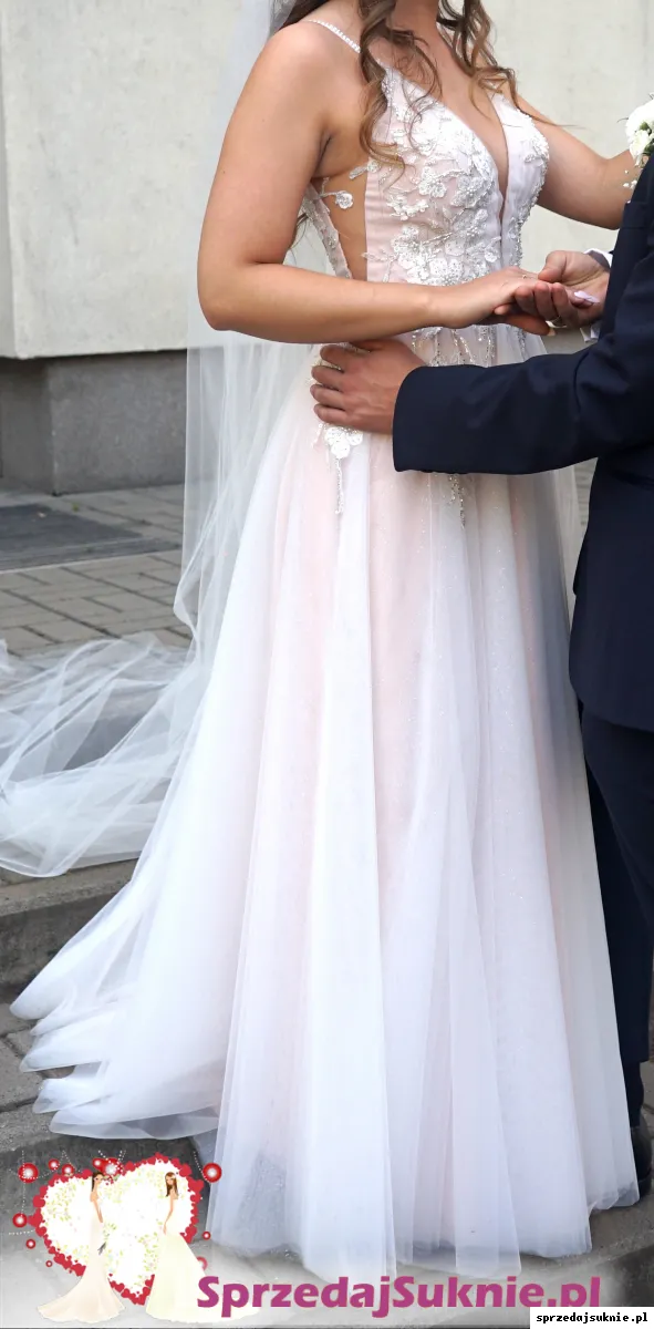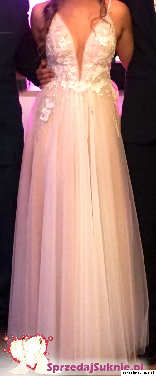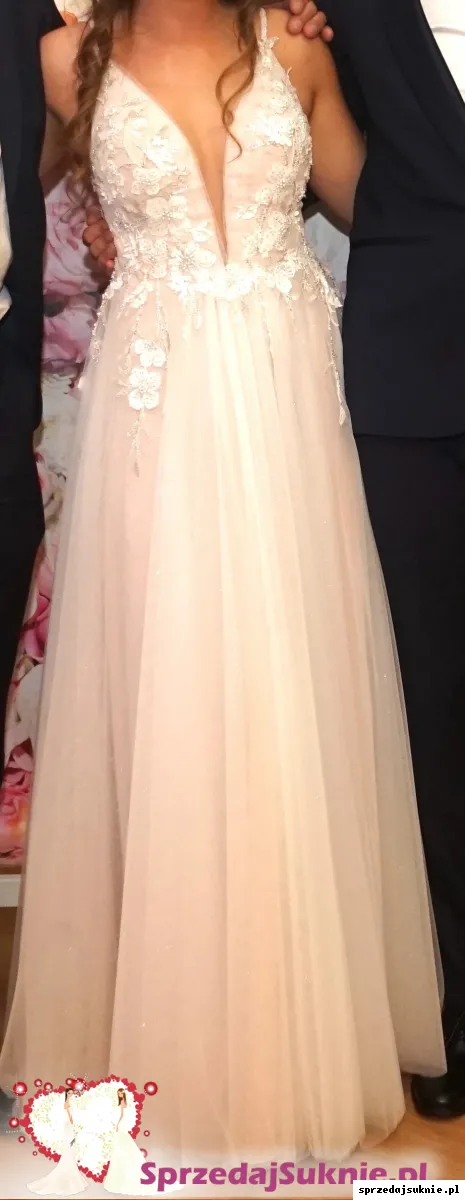 Suknia jest koloru delikatnego różu/brzoskwini. Ramiączka są silikonowe, nie spadają nawet podczas tańca i co najważniejsze- nie podrażniają skóry. Z tyłu suknia posiada jedynie zamek błyskawiczny, który ułatwia przygotowywanie do Ślubu :)