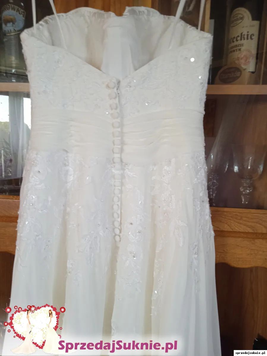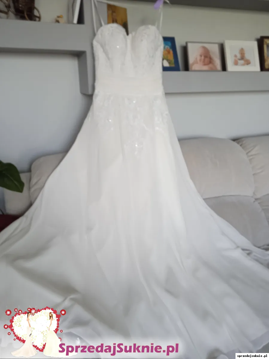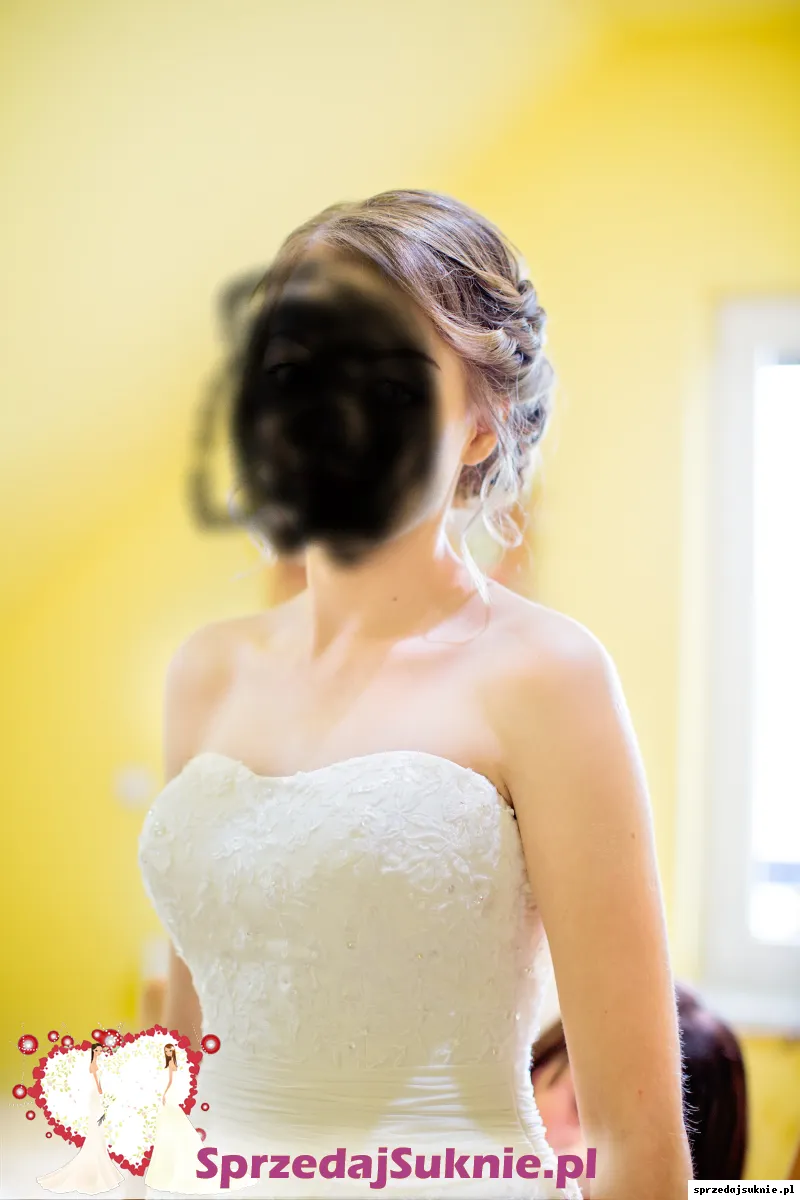 Suknia ślubna w kolorze śmietanki, założona dwa razy - na ślub i do sesji. Suknia bez ramiączek, posiada wszyty biustonosz, który doskonale podtrzymuje biust. Bolerko było pożyczone, więc nie podlega sprzedaży. Suknia w rozmiarze M na wzros 170 plus obcas 7 cm. Stan bardzo dobry, odebrana po czyszczeniu i zapakowana w pokrowiec. Więcej zdjęć mogę przesłać w prywatnej wiadomości. Możliwy odbiór osobisty w okolicach Wojnicza, bądź wysyłka.