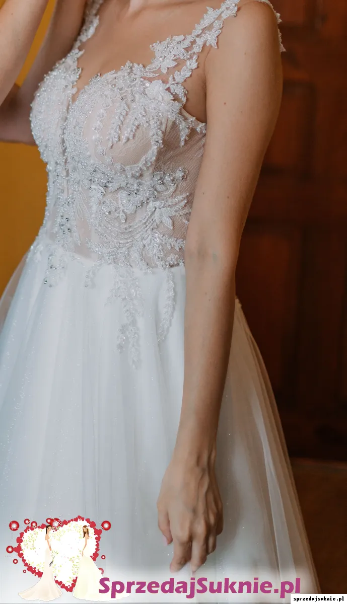 Sprzedaję piękną suknię ślubną, która będzie pasować na osobę noszącą rozmiar XS/S lub M po małych przeróbkach krawieckich. Sukienka szyta była na 167cm. Dół sukni składa się z kilku warstw materiału i tiulu, a jedna z nich jest brokatowa. Gorset zapina się na guziki i również jest ozdobiony. Suknia została wyprana i czeka na nową właścicielkę. Szczegóły podam w wiadomości. Zapraszam do przymierzenia. Mogę dorzucić koło i krótki welon do kompletu.