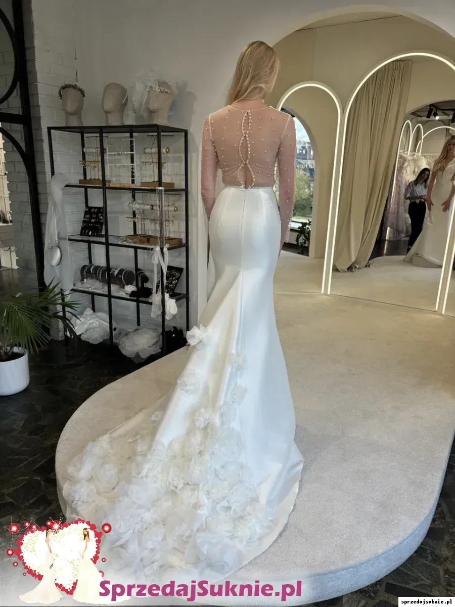 Unikalna suknia ślubna uszyta na zamówienie. Rękawy ozdobione perłami. Posiada długi niesamowity tren ozdobiony kwiatami. Przepięknie podkreśla sylwetkę