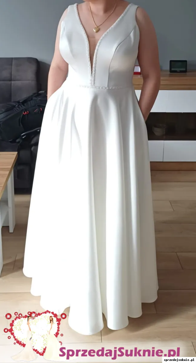 Tkanina, z której jest wykonana suknia to mikado. Materiał jest delikatny, oddychający i pięknie sie układa.