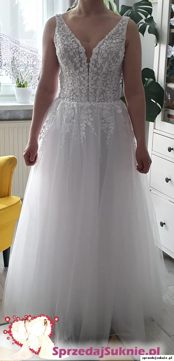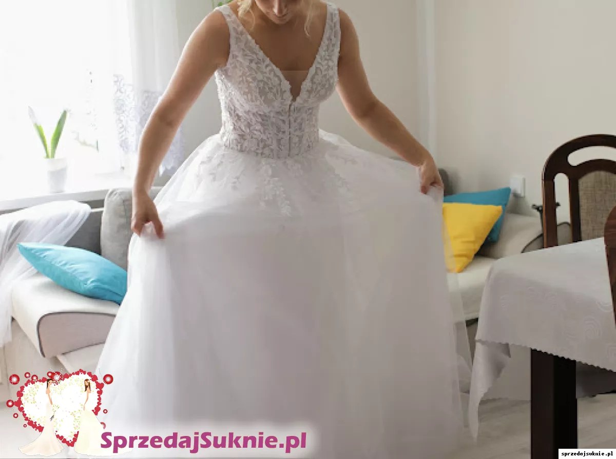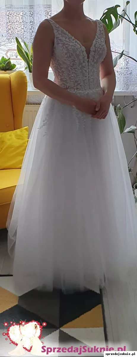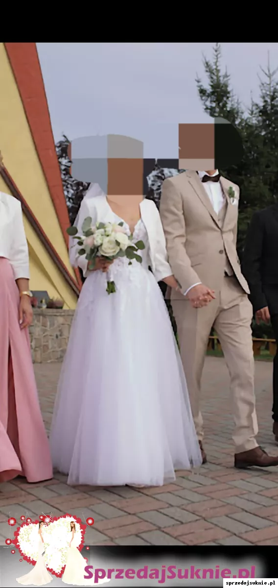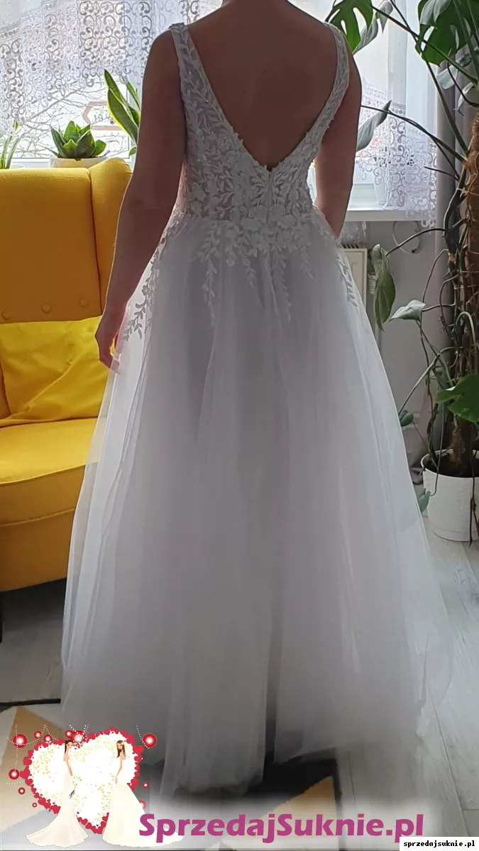 Sprzedam suknie ślubną bardzo wygodna i lekka, czysta biel, jedna warstwa tiulu z brokatem. Suknia była szyta na miarę rozmiar 36/38. Stan bardzo dobry, suknia jest po praniu w salonie. Zapraszam do kontaktu.