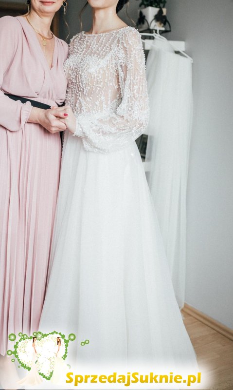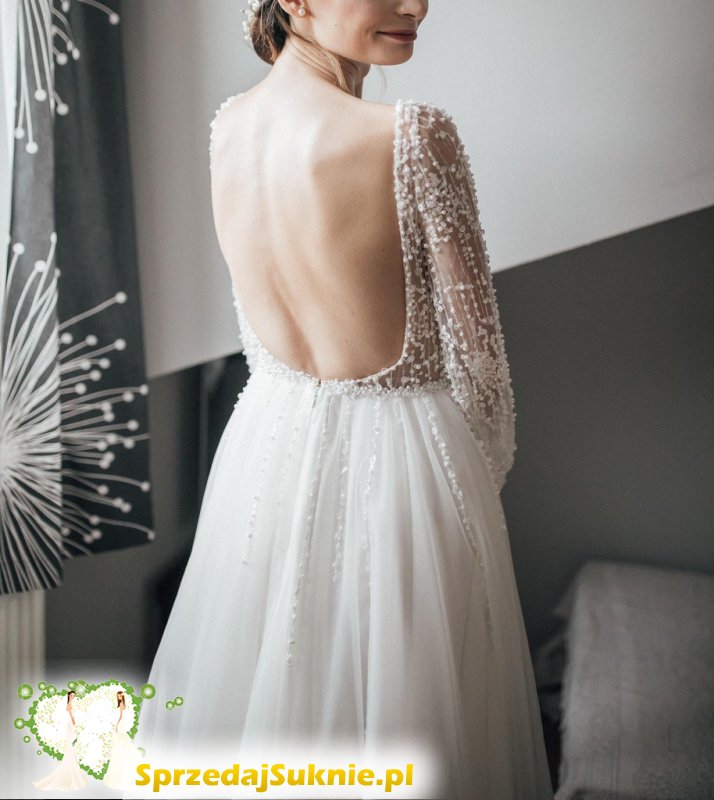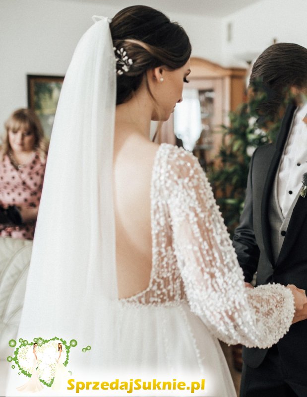 Posiadam do sprzednia suknie kolor ivory z markowego krakowskiego salonu Avenue 22. Suknia jest dopasowana górą wyszyta różnorodnymi koralikami plecy w całości otwarte. Biustonosz wbudowany w suknie. Na wzrost 172 cm. Dodaje w gratisie welon z włoskiego tiulu 2.5 m