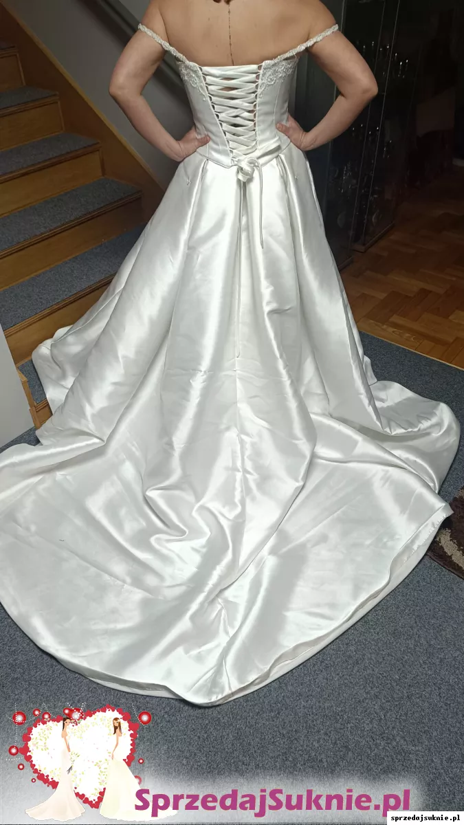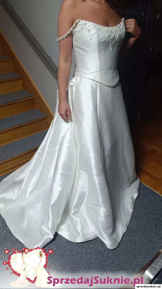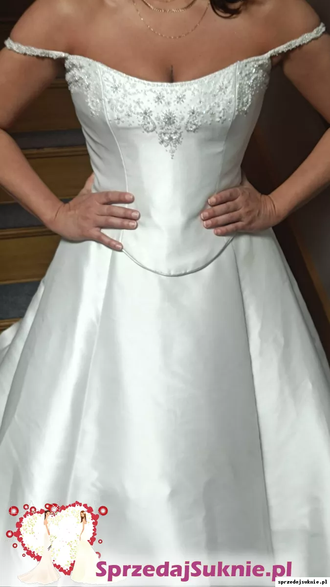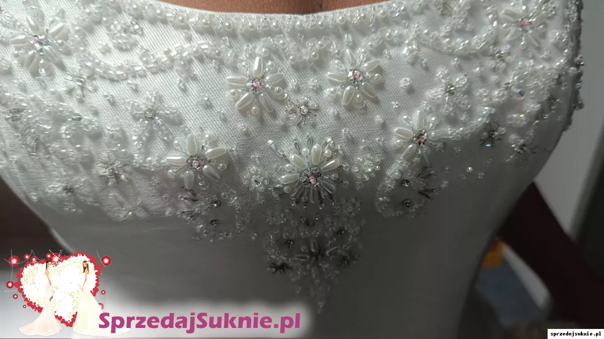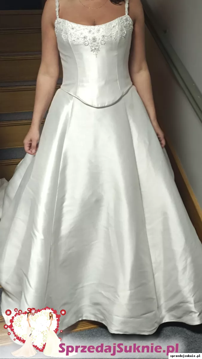 Suknia piękna. Krój ponadczasowy. Nadal modna. Piękne kryształki. Bardzo wygodna. Dzieki sznurowanemu gorsetowi rozmiar między 38 -44. Gorset skonstuawany w sposób idealnie dopasowywujący sie do krągłości kobiecych kształtów. Idealnie podtrzymuje piersi dzięki czemu nie potrzeba zakładać biustonosza pod spód . Podkreśla talię. Wyszczupla. Spódnica długa z trenem ,który w łatwy sposób można podpiąć po ceremoni zaślubin. Tren fantastycznie prezentuje sie na pierwszą część ceremoni ,kiedy spektakularnie suniesz aleją ku swemu wybrankowi.