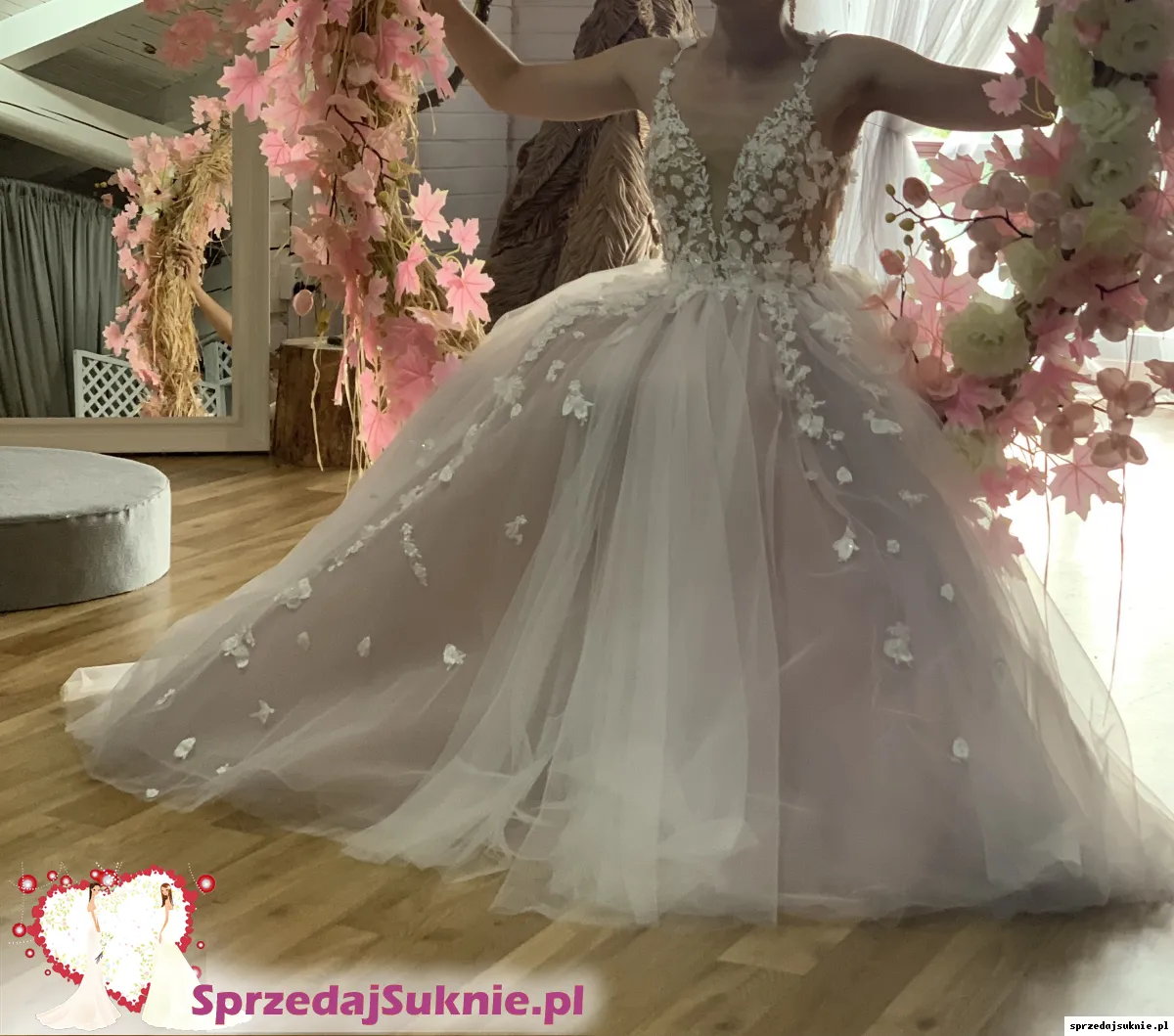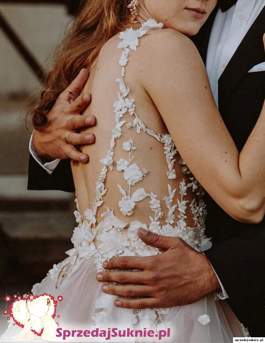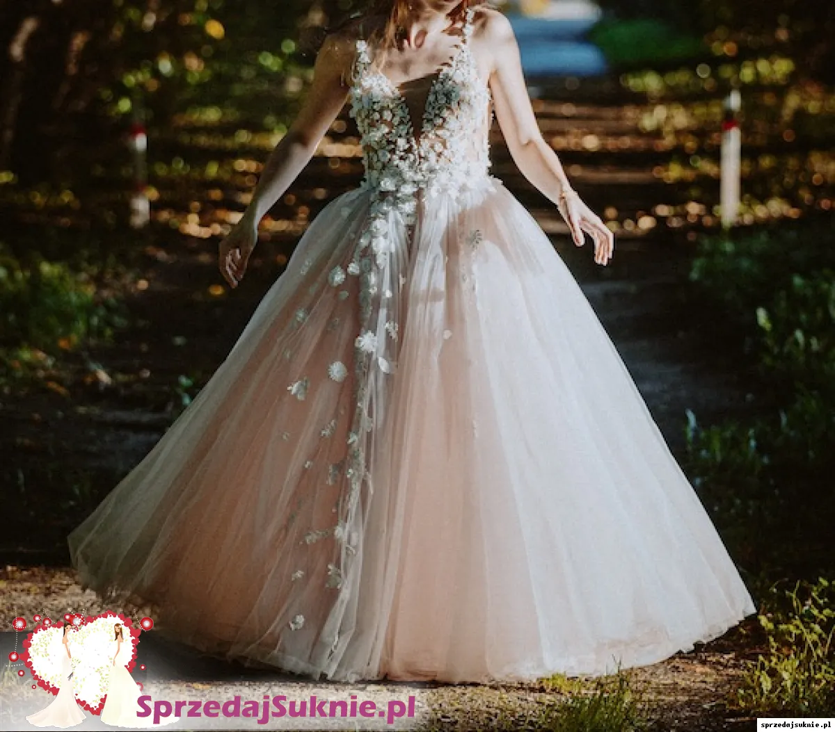 Suknia uszyta była ręcznie, każdy element oddzielnie przyszywany z doszytymi cyrkoniami w kwiatkach. Ślicznie zdobiona kwiatami 3d.