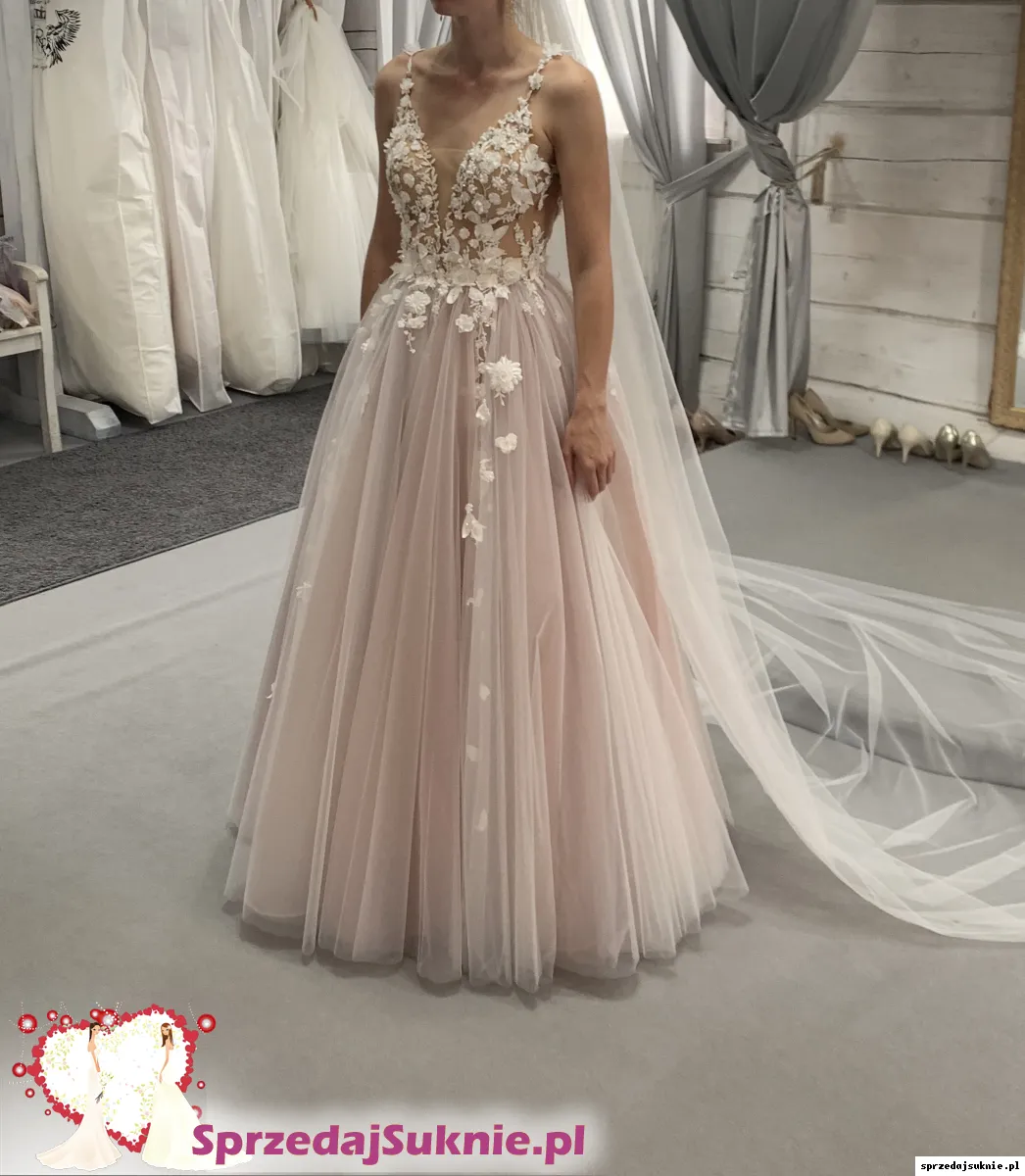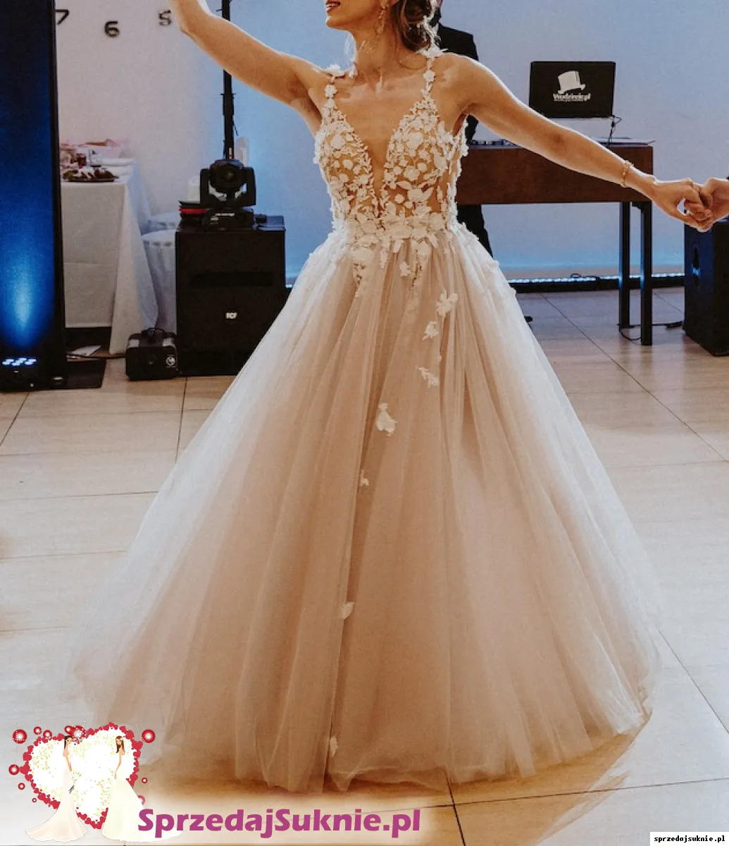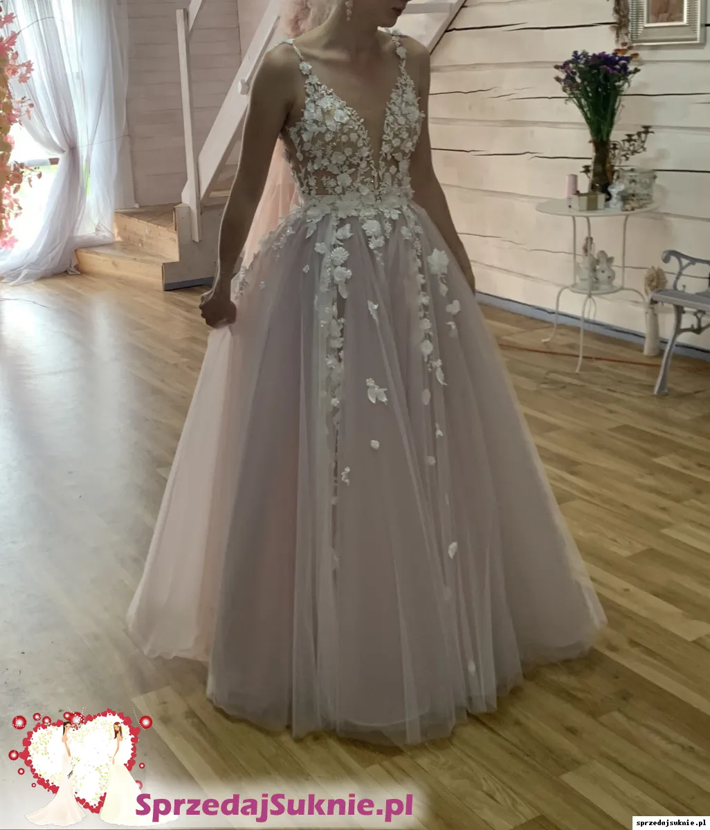 Suknia uszyta była ręcznie, każdy element oddzielnie przyszywany z doszytymi cyrkoniami w kwiatkach. Ślicznie zdobiona kwiatami 3d.