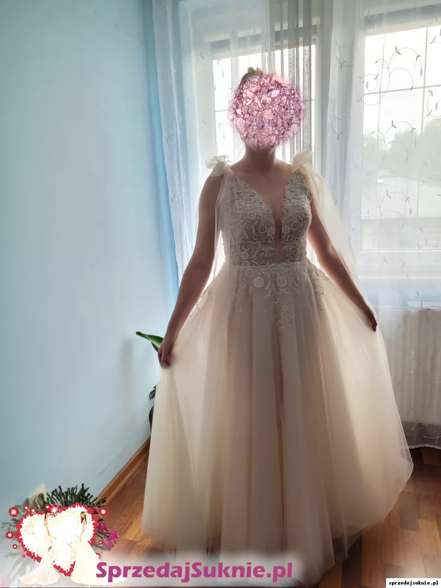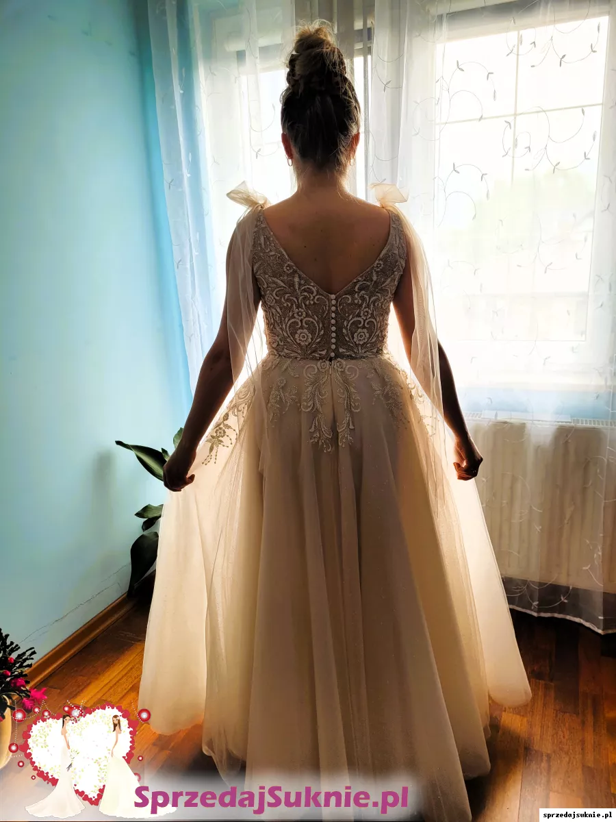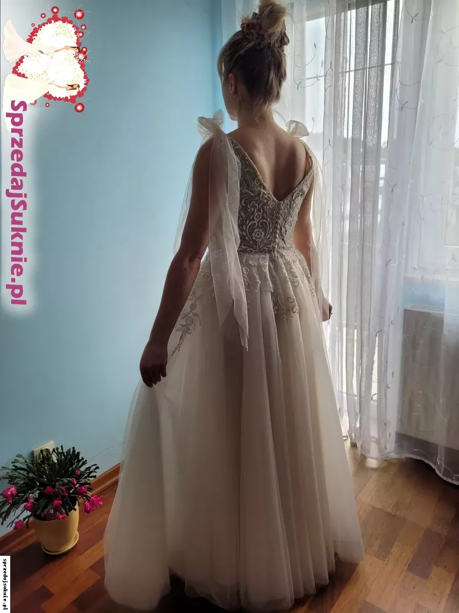 Suknia posiada również odpinane kokardy na ramionach.