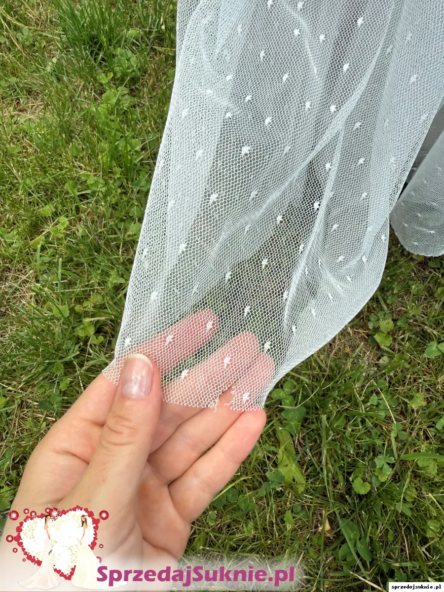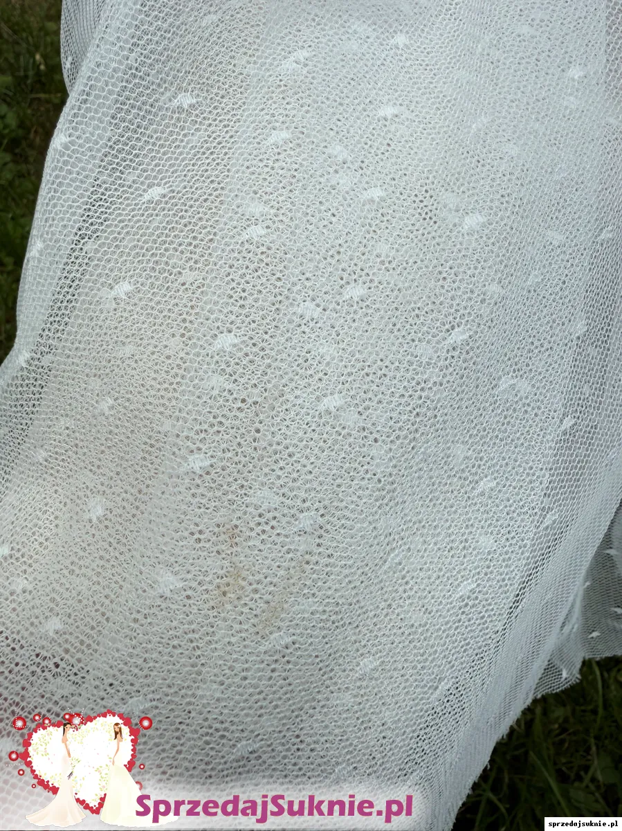 Tiul jest bardzo delikatnie uszkodzonym w jednym miejscu na dole, co można łatwo skrócić. W innym miejscu na tiulu występuje niewielkie zabrudzenie - przedstawione na zdjęciach.