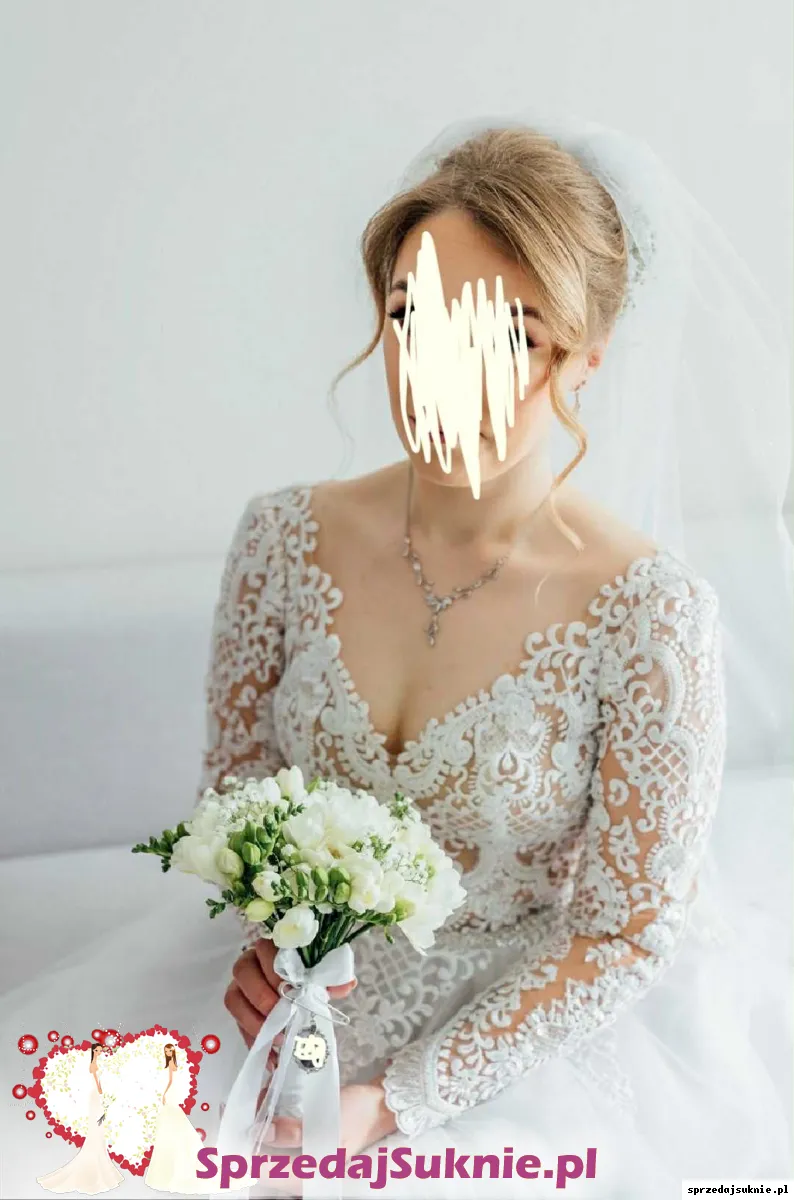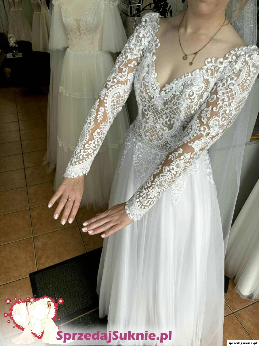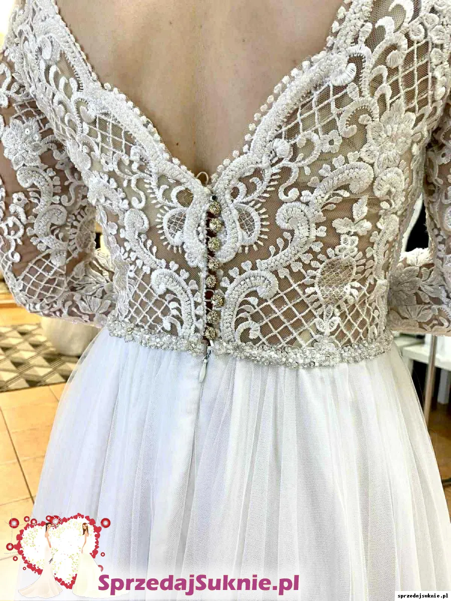 Model z pięknymi rękawami wykonanymi z koronki o unikatowych wzorach zakończonych aż na spódnicy sukni, a to wszystko w stylu boho. Głęboki dekolt na plecach w kształcie litery „V” z ozdobnymi guzikami.