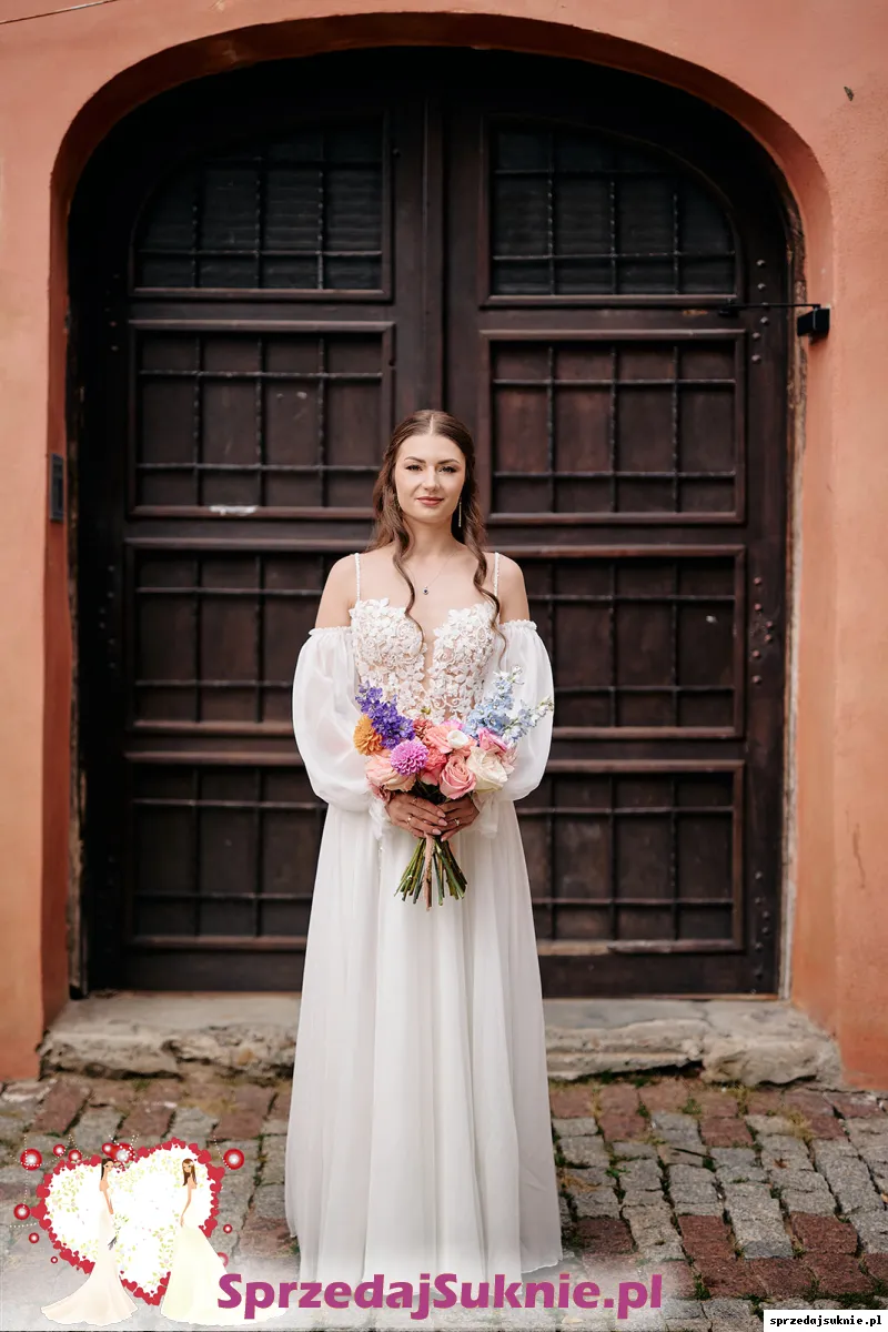 Delikatna, elegancka suknia ślubna w kolorze białym. Góra wykonana z subtelnej koronki z głębokim dekoltem w kształcie litery V, pięknie podkreślającym sylwetkę. Suknia posiada zwiewne, transparentne rękawy typu hiszpanka, które dodają lekkości i romantycznego charakteru.