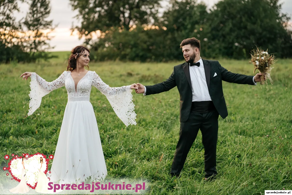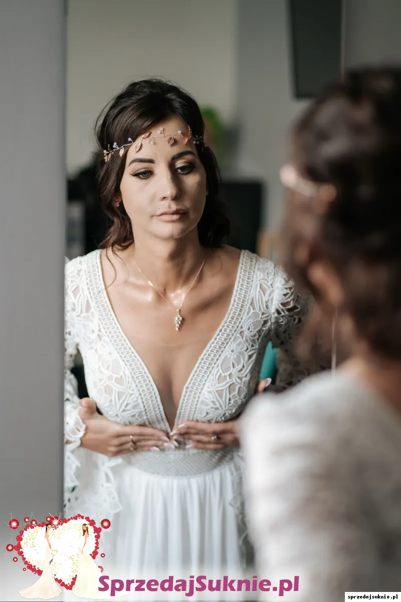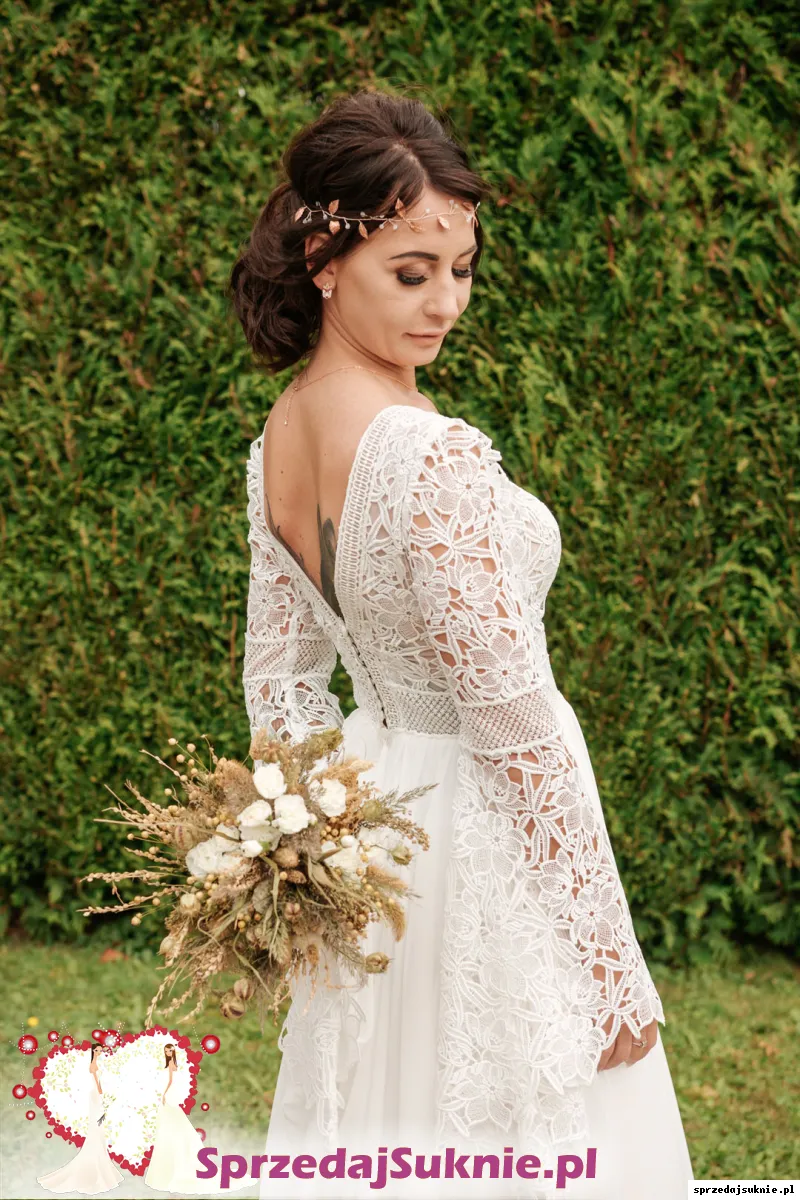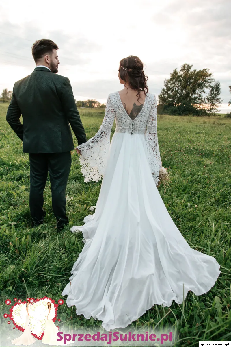 Witam, posiadam na sprzedaż suknię ślubną w stylu Boho, bardzo wygodna, stan jak nowy bez żadnych uszkodzeń i wad. Suknia szyta na wzrost 167, rozmiar XS/S ,dol muślinowy bardzo zwiewny, dynamiczny w tańcu, z podpinanym trenem (widoczny na zdjęciu), góra wykonana z solidnej grubej koronki przez co nie ma mowy o rozerwaniu koronki. Rękawki rozszerzane. Na wysokości biustu wszyste miseczki usztywniane typu push up, które można wypruć.