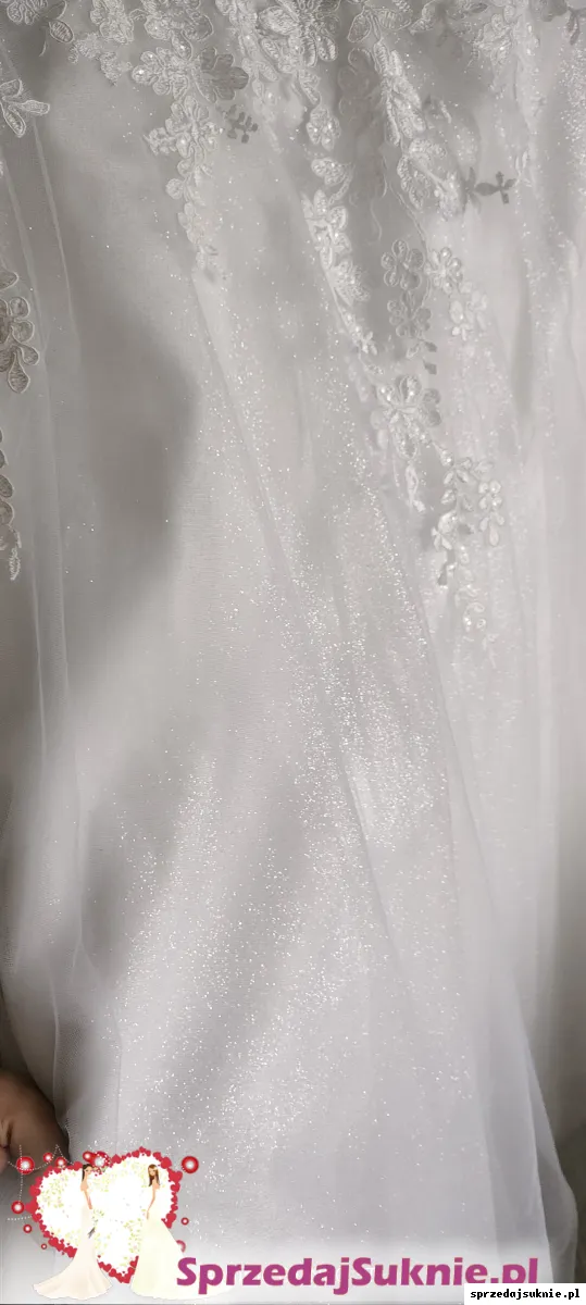 Ma warstwę brokatu, pięknie się błyszczy. Zapinana na haftki i zamek. Przedłużony rekawek. Jest po praniu chemicznym. Na pierwszej warstwie tiulu małe dziureczki