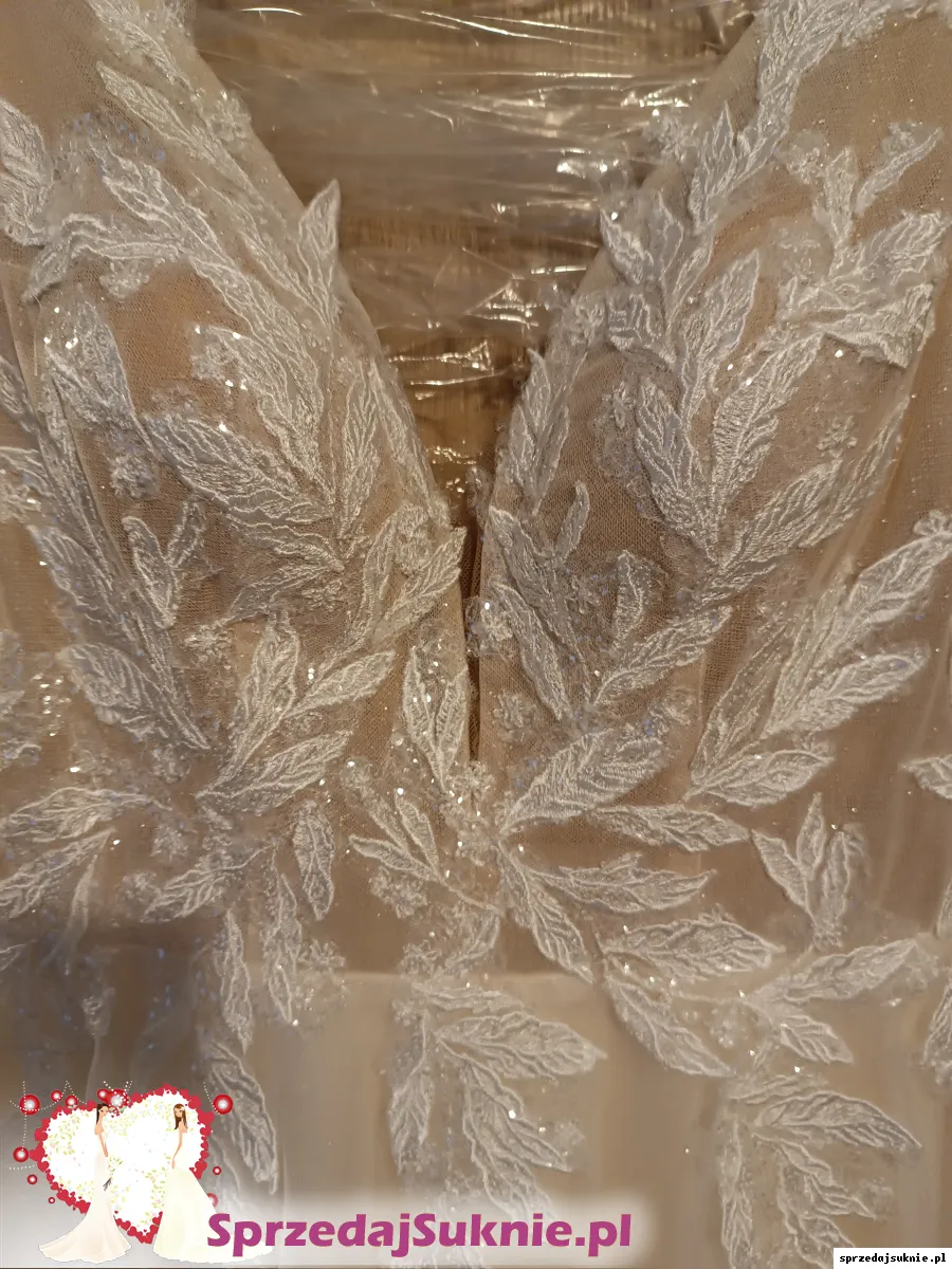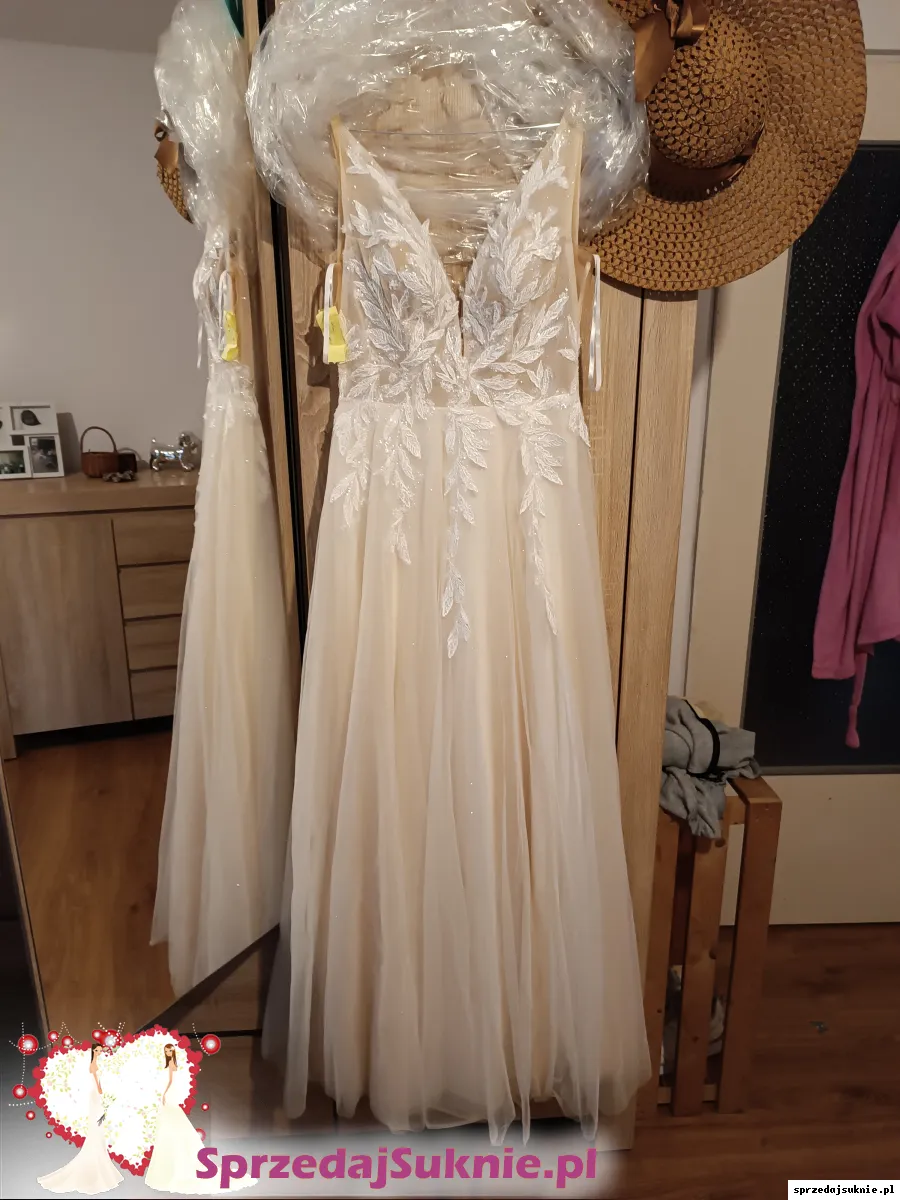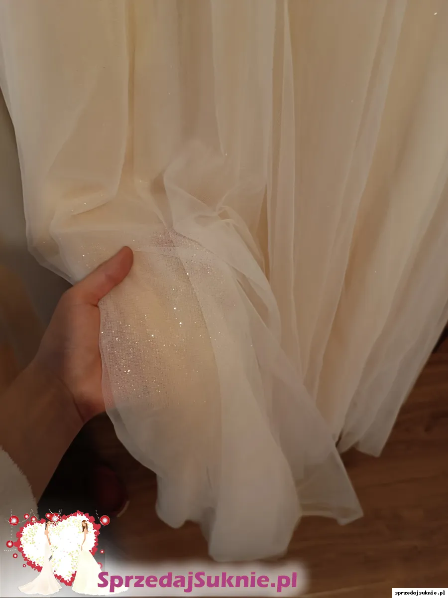 Suknia ślubna w kolorze delikatnej brzoskwini, cała mieniąca się. Wyczyszczona w pralni chemicznej. Nie posiada żadnych wad, żadnych śladów użytkowania. Na zdjęciu umowy podane są wymiary panny młodej. Miseczki podwójne doszyte, można je odpiąć.