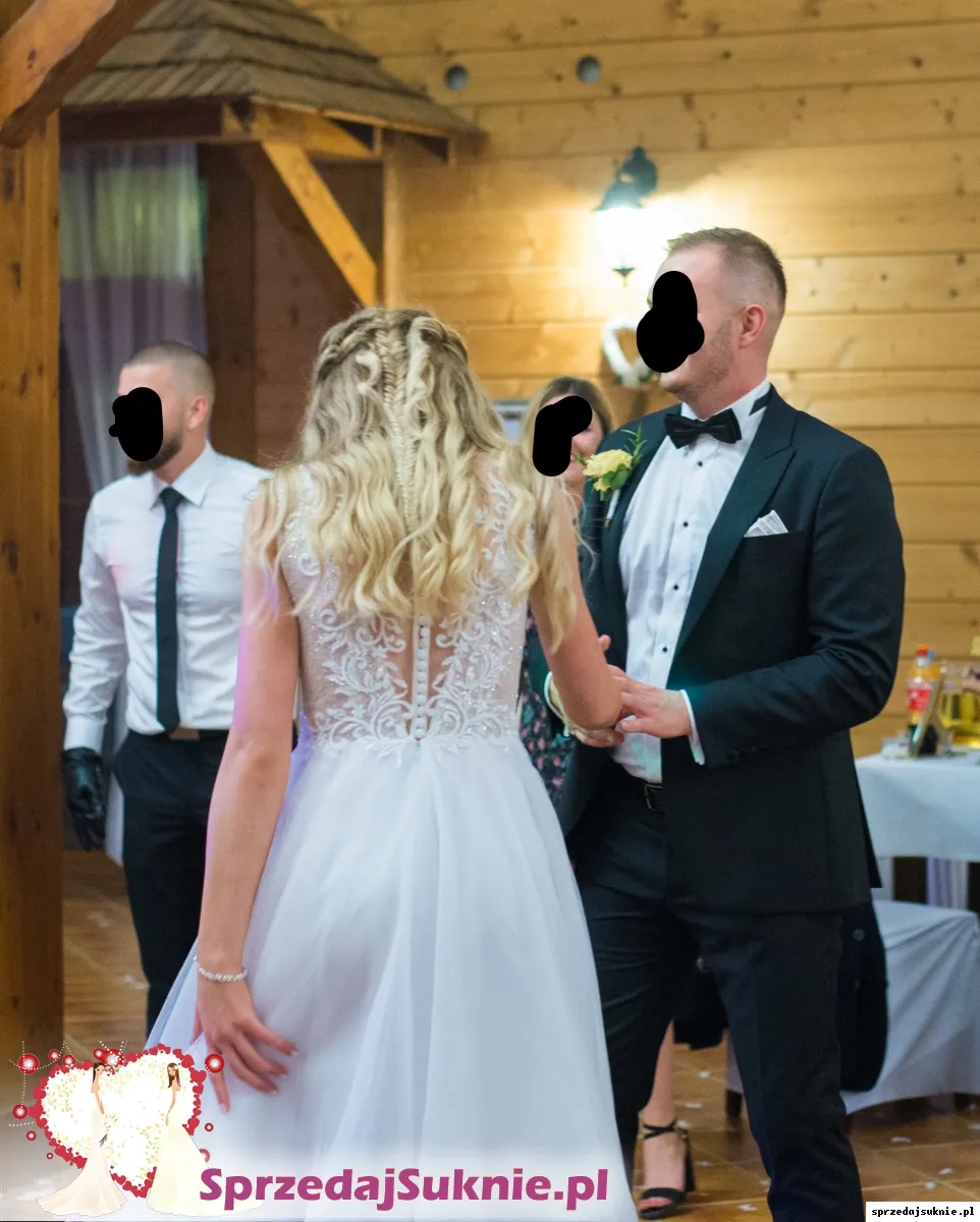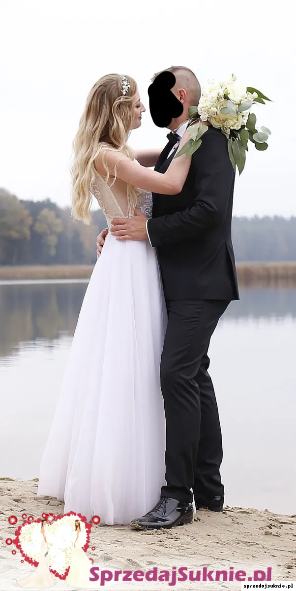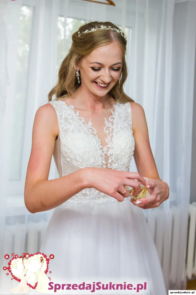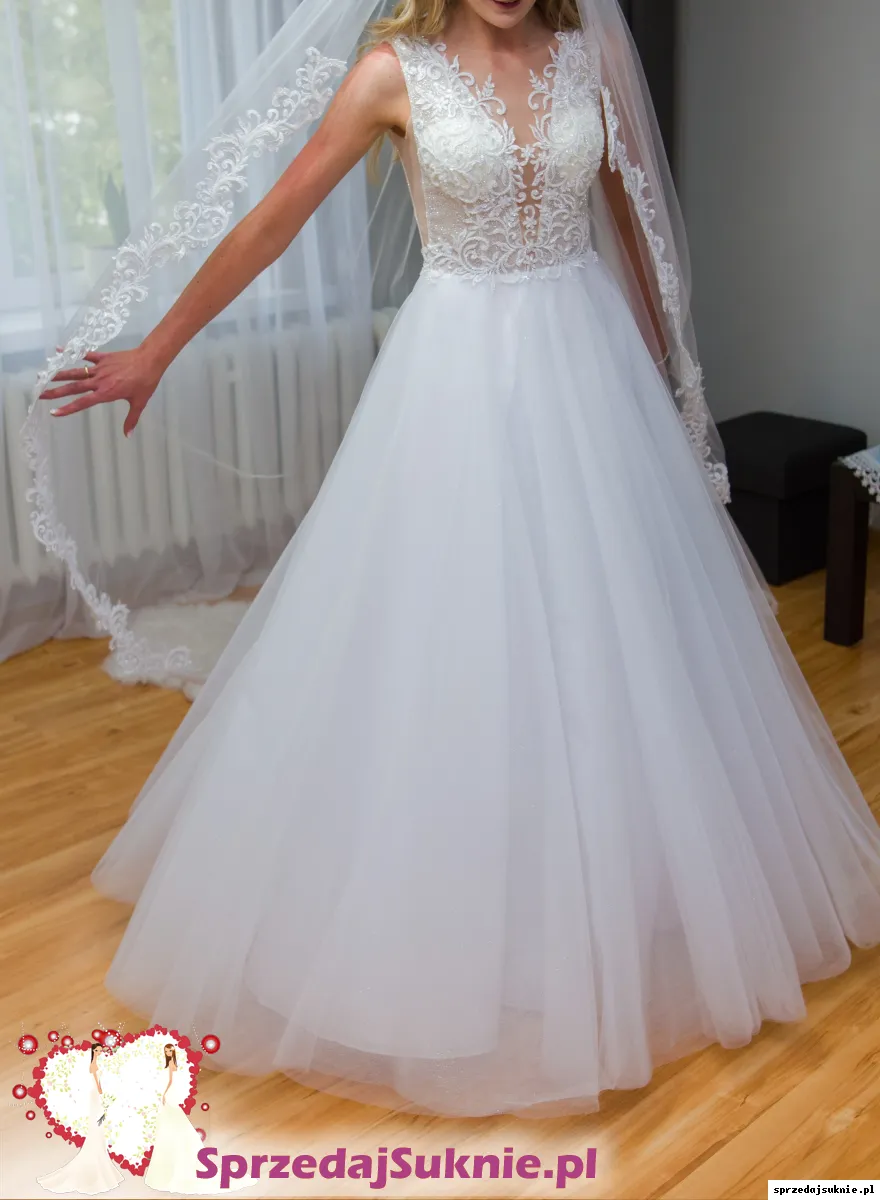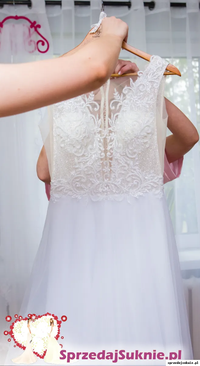 Sprzedam suknię ślubną w stanie idealnym, w typie A. Dekolt V, plecy delikatnie zabudowane. Suknia na rozmiar 36/38. Długość na 175cm + 6cm obcas, w razie potrzeby bez problemu można również skrócić, gdyż dół to delikatny lekki tiul w kolorze diamentowej bieli z drobinkami brokatu, który wystarczy podciąć. Góra sukni to delikatną koronką naszytą na cielistą siateczkę. Całość zdobią srebrne drobinki brokatu przez co suknia ślicznie mieni się w świetle. Tył sukni zdobi koronka oraz guziczki, dzięki czemu suknia idealnie się trzyma i nie krępuje ruchów. Suknia bardzo lekka, wygodna. Na sprzedaż również dwa welony I ozdoba do włosów w formie wianka, na miekkim druciku :)