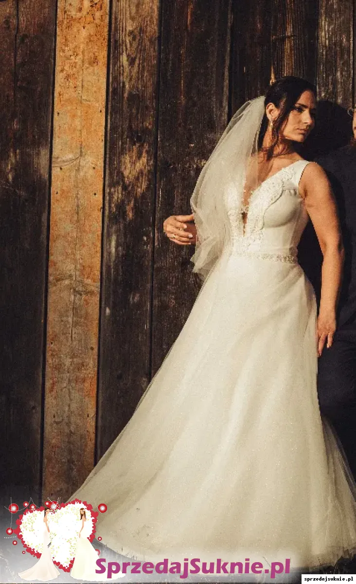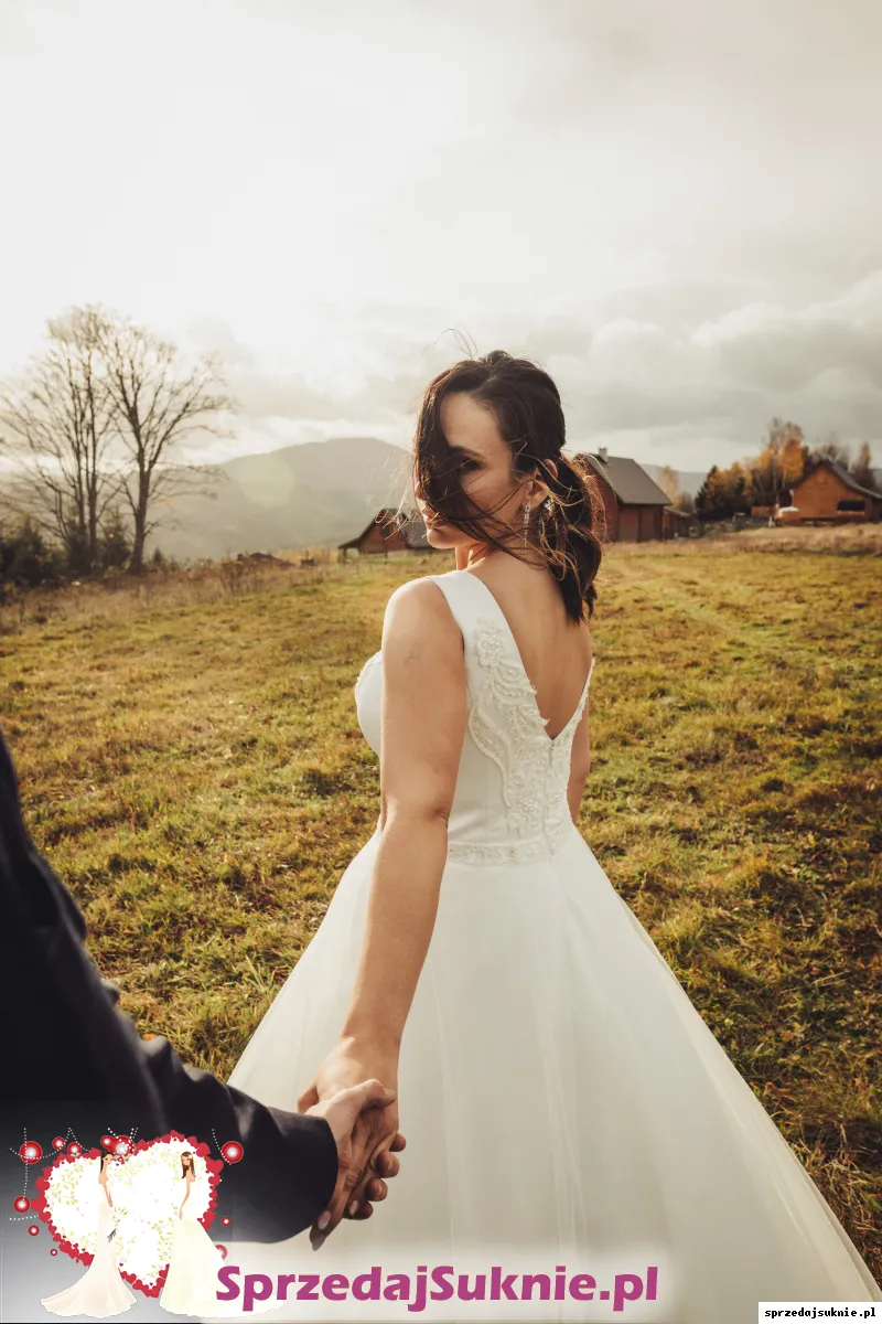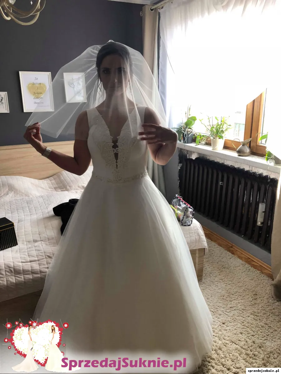 Przedmiotem sprzedaży jest sukienka ślubna w kolorze śmietanki.