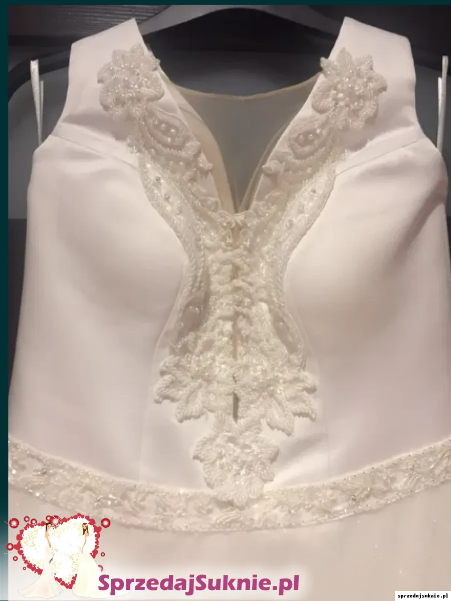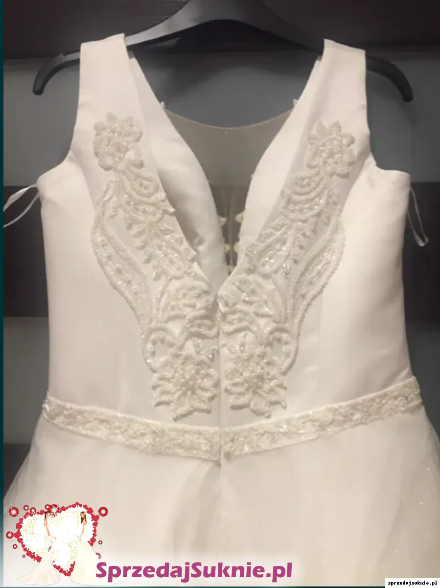 Tył sukni jest w literkę V. Również ozdobiony perełkami. Suknia dobrze się trzyma, jest wygodna, ukrywa mankamenty i uwydatnia atrybuty.