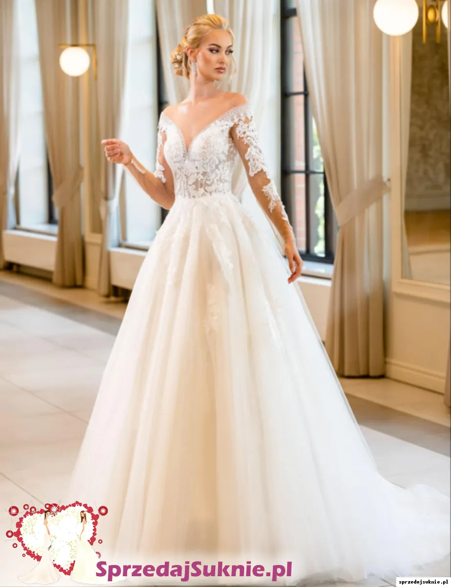 Gorset sukni ma opadające ramiona , zabezpieczone siatką przed opadaniem. Długi koronkowy rękaw nadaje sukni spektakularny wygląd .