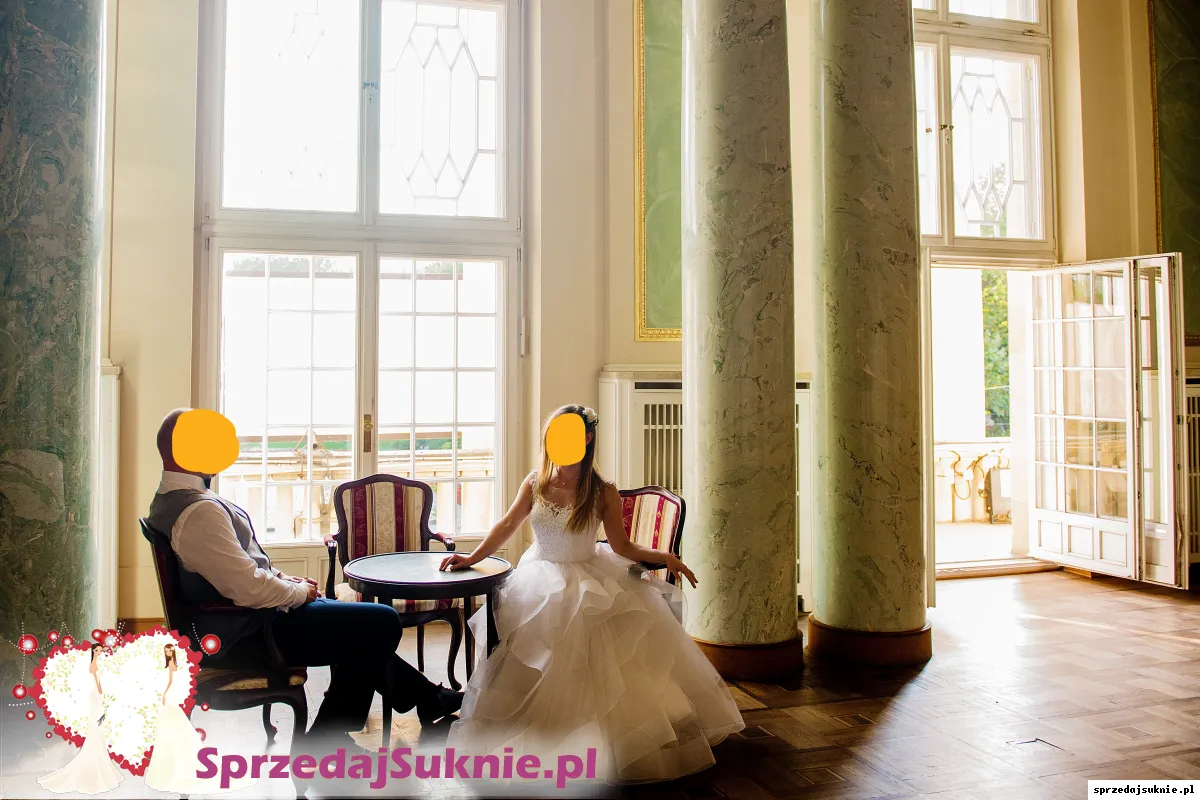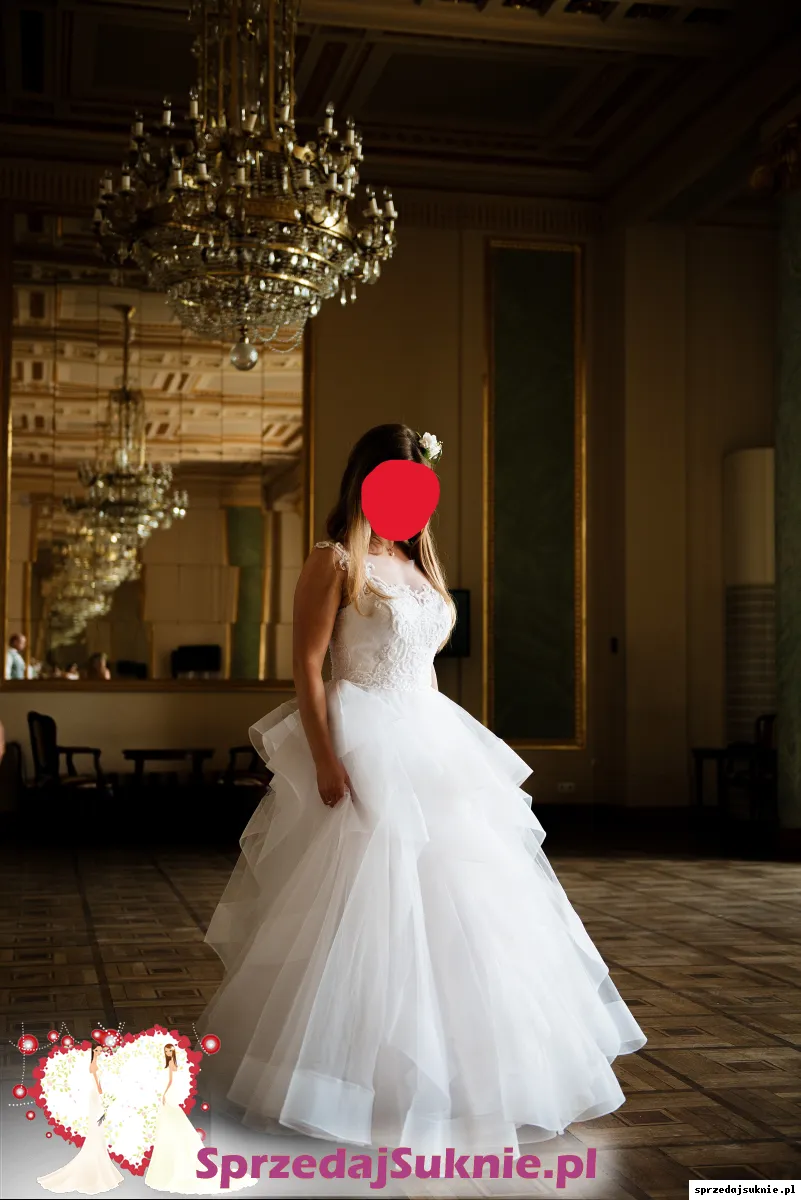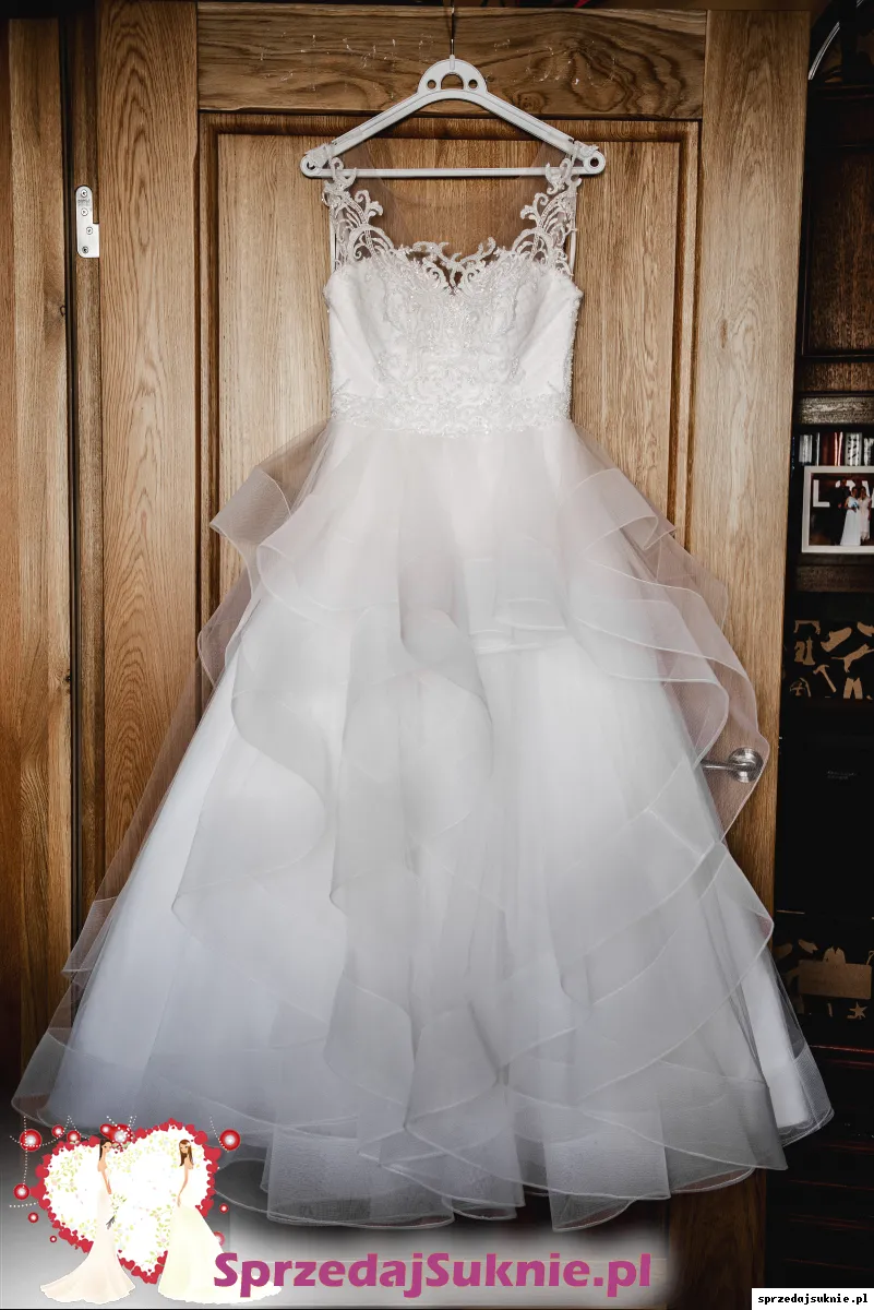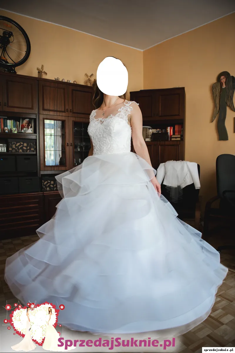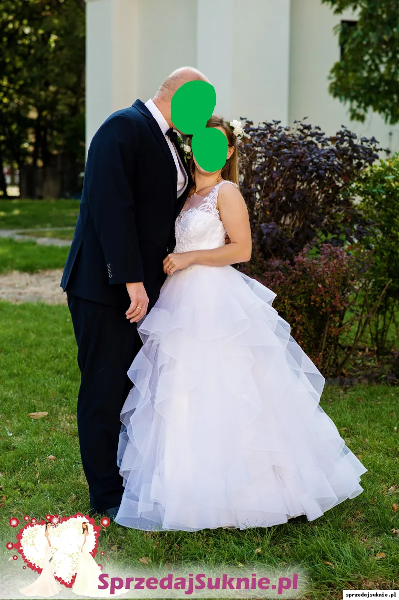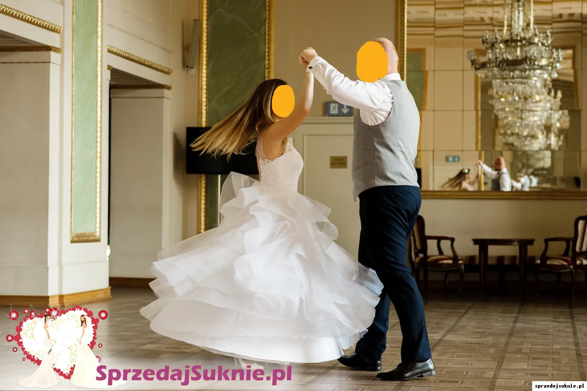 Biała suknia ślubna z falbanami, które cudownie układają się w tańcu. Pomimo kilku warstw materiału suknia jest niezwykle lekka i nie sprawia problemu przy poruszaniu się, nawet na wysokich obcasach :)
