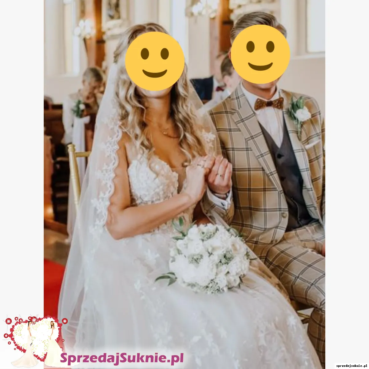 Piękna suknia ślubna szyta na miarę. Kupiona w Kreacja Żannet w Poznaniu. Kolor śmietana. Mam 167 cm wzrostu. Rozmiar góry sukni M. Dodatkowo welon, obszyty kwiatami do kompletu. Welon sięga do końca sukni. Całość pięknie się prezentuje a suknia była bardzo wygodna i ślicznie wyglądała podczas tańca. Cena do negocjacji.