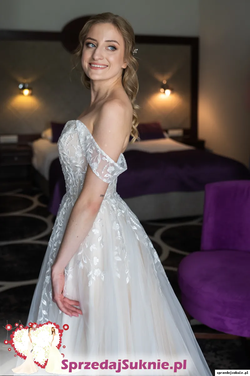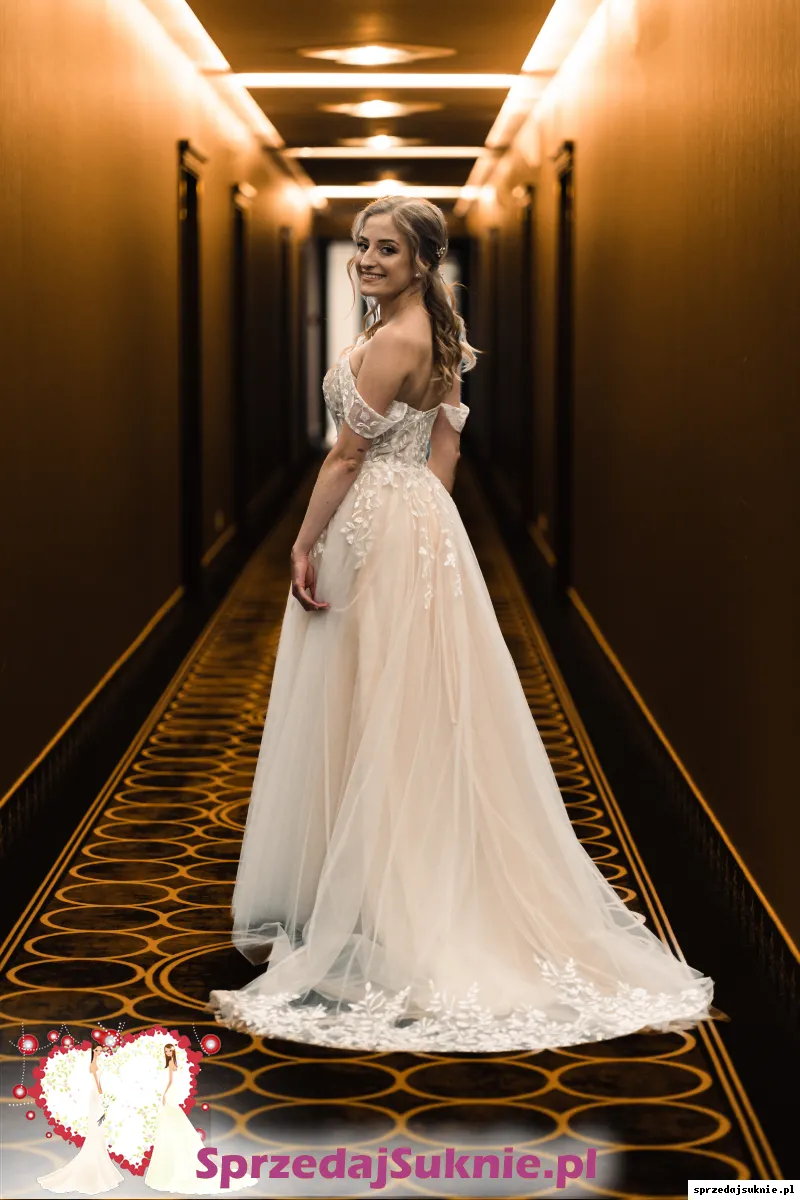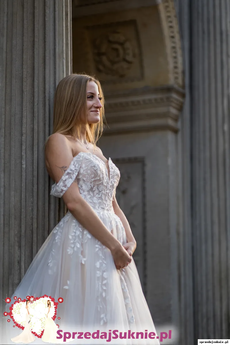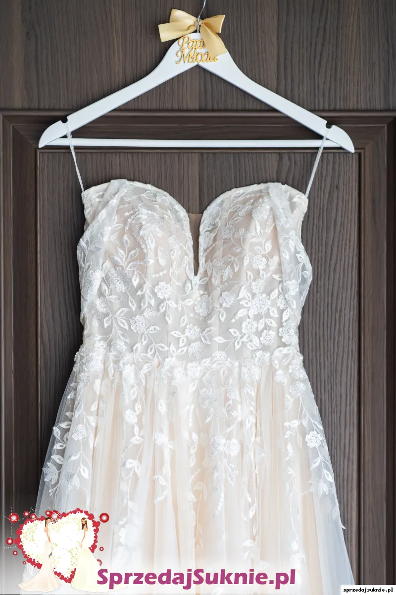 Sprzedam suknie ślubną kupioną w 2022 roku w salonie sukien ślubnych First Lady w Pruszczu Gdańskim. Suknia była założona dwa razy, w dniu ślubu oraz na sesje zdjęciową. Została wyprana w pralni chemicznej dzięki czemu widnieją minimalne ślady użytkowania. Suknia posiada podpinany tren z pięknym kwiatowym wykończeniem, który na ziemi tworzy półokrąg. Posiada również wszyte miseczki.