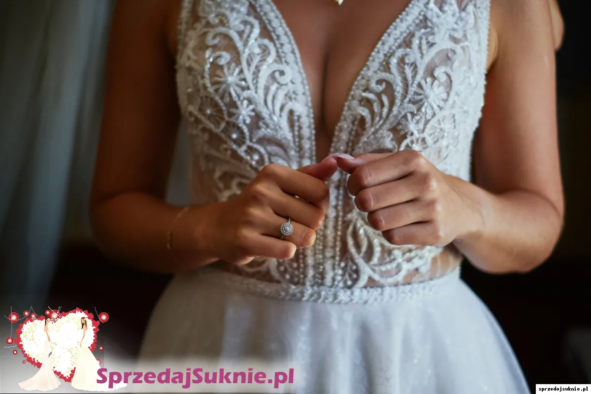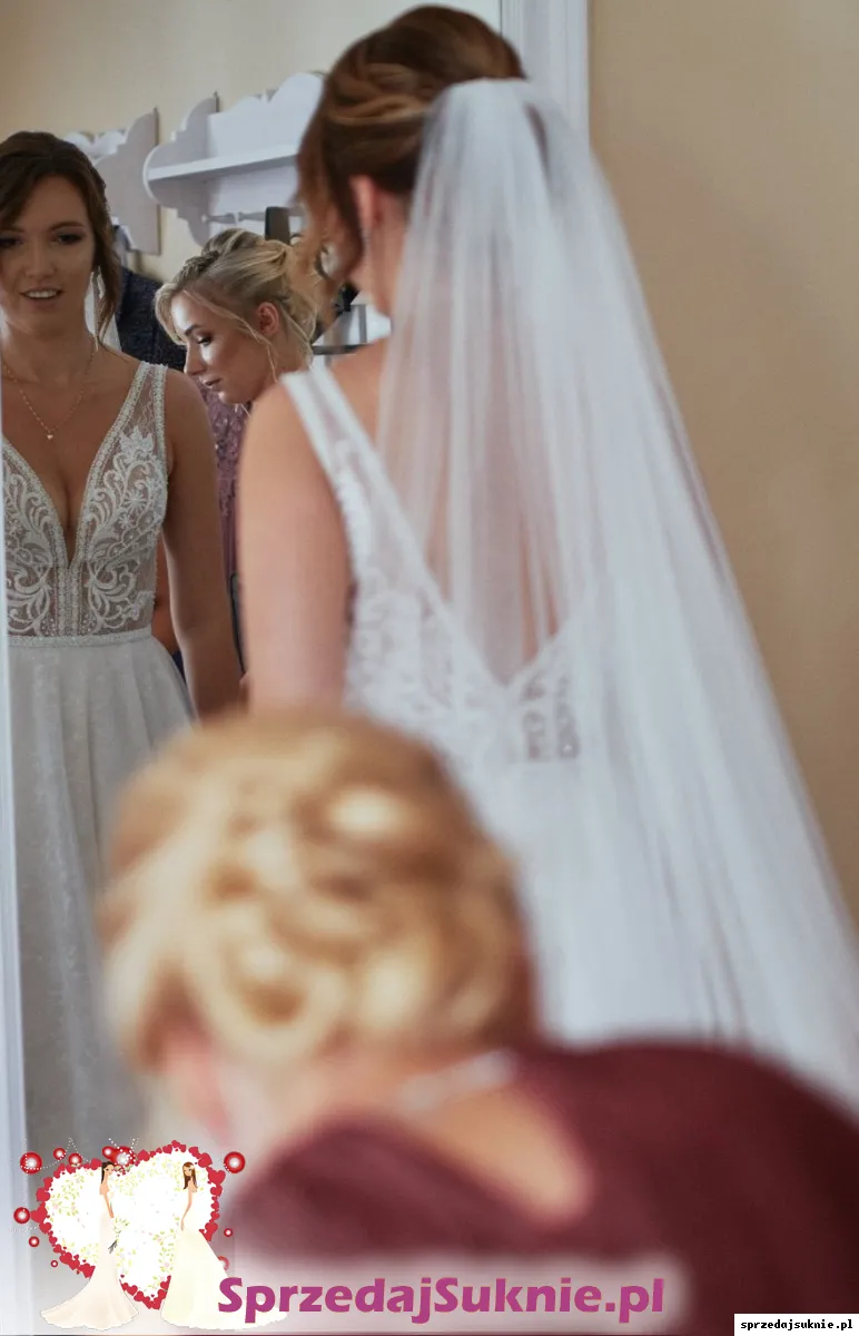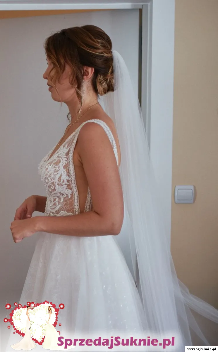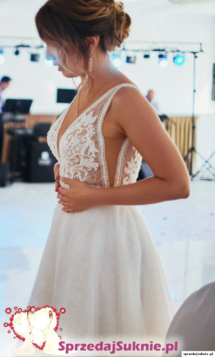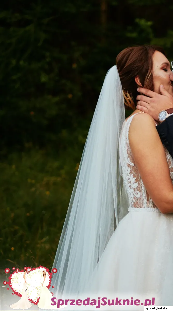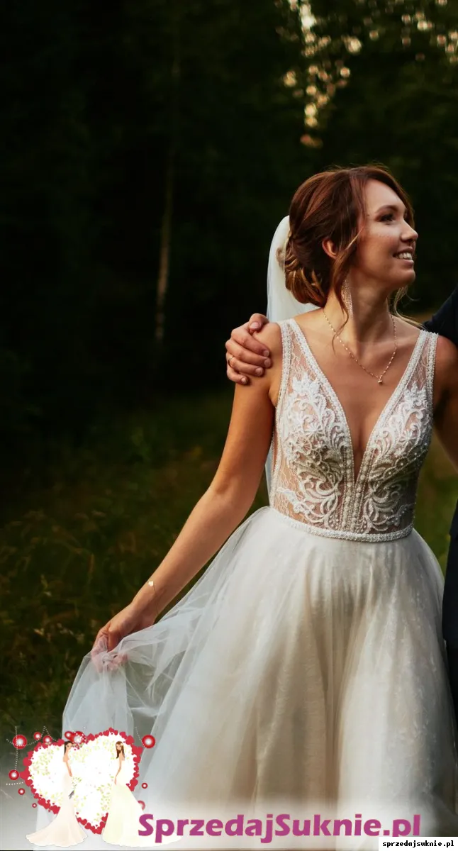 Sukienka w stanie idealnym. Nie ma żadnych uszkodzeń. Zakupiona w salonie sukien ślubnych Ksymena. Kolor: Ivory Inude oryginał. Sukienka nie brała udziału w sesji plenerowej (pierwsze zdjęcie jest zrobione na trawie obok sali).