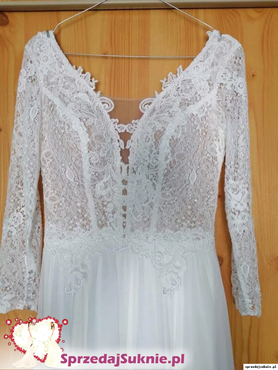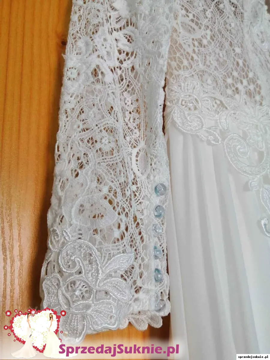 Suknia jest zachowana w idealnym stanie. Koronka jest w całości bez uszkodzeń.