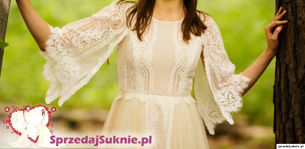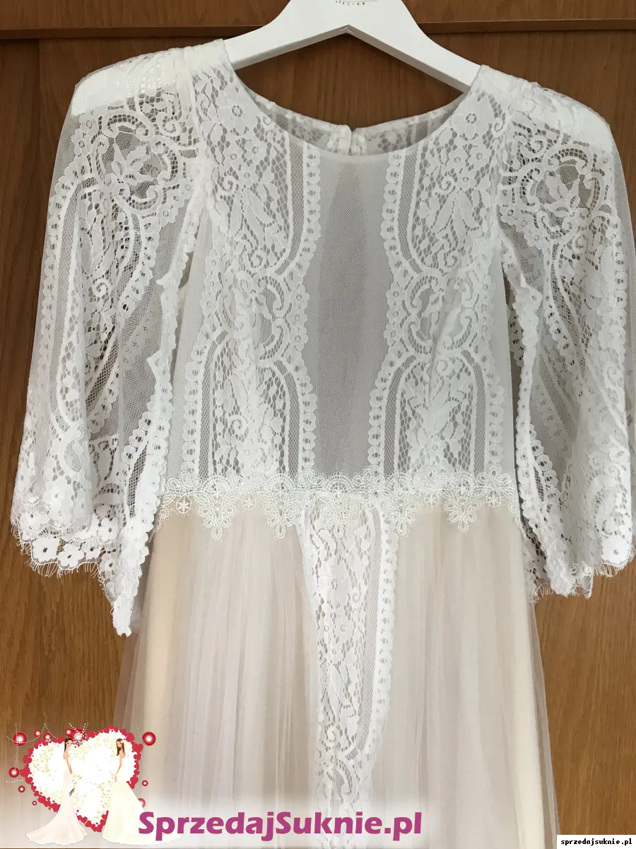 Góra koronkowa, rękawy motylki sięgające do łokcia, spódnica tiulowa z koronkową wstawką, plecy zakryte, guziki perełki. Kolor biały, halka cielista. Suknia jest zwiewna, pięknie się układa. Została wyczyszczona, brak śladów noszenia. Można ją dowolnie modyfikować, dopasować do sylwetki.