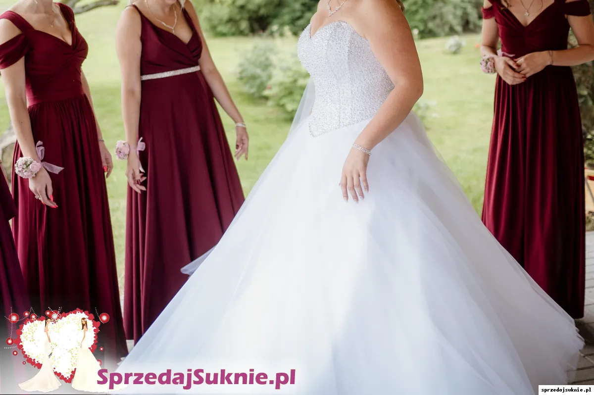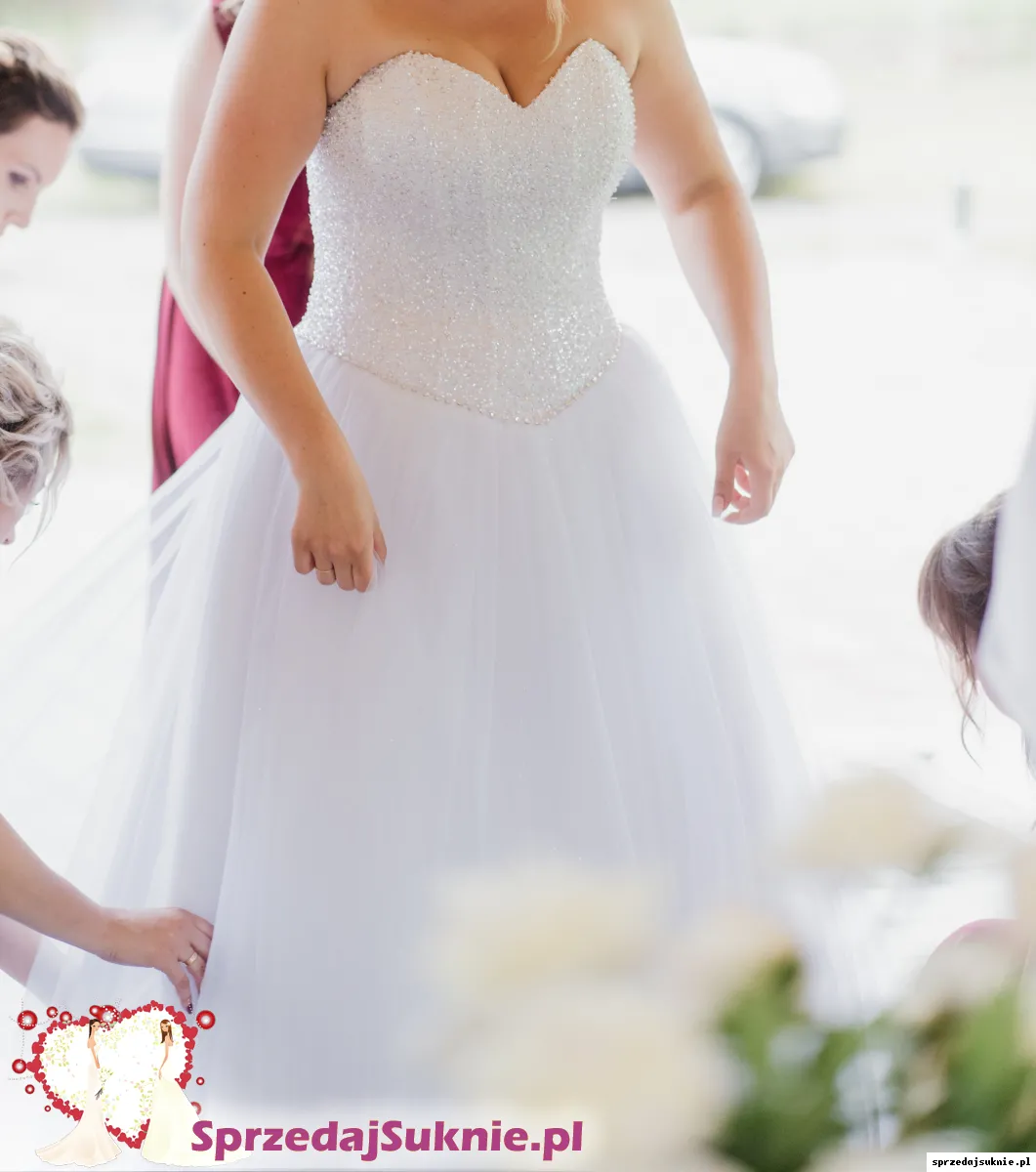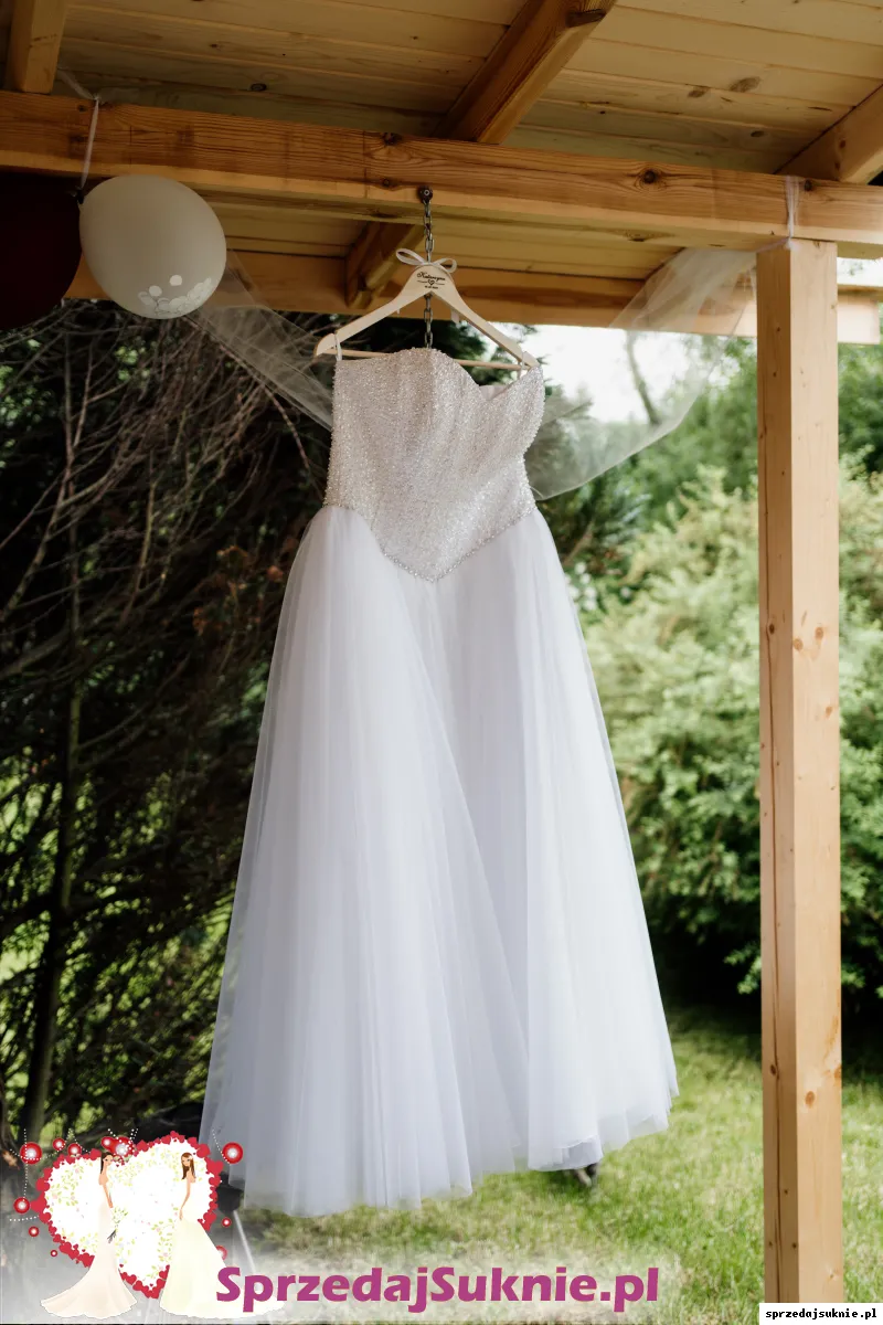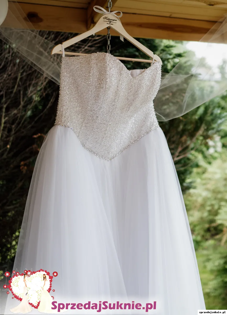 Na sprzedaż suknia śluba szyta na miarę w salonie sukien ślubych w Opolu w 2021. Rozmiar 40-44, wzrost 164 + 10 cm szpilka. Gorset regulowany wyszywany ręcznie perełkami, koralikami i kryształkami swarovskiego. Dół sukni składa się z kilku warstw tiulu w tym jedna z drobinkami brokatu.