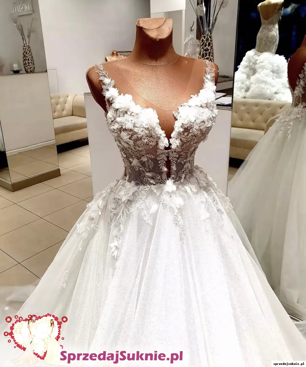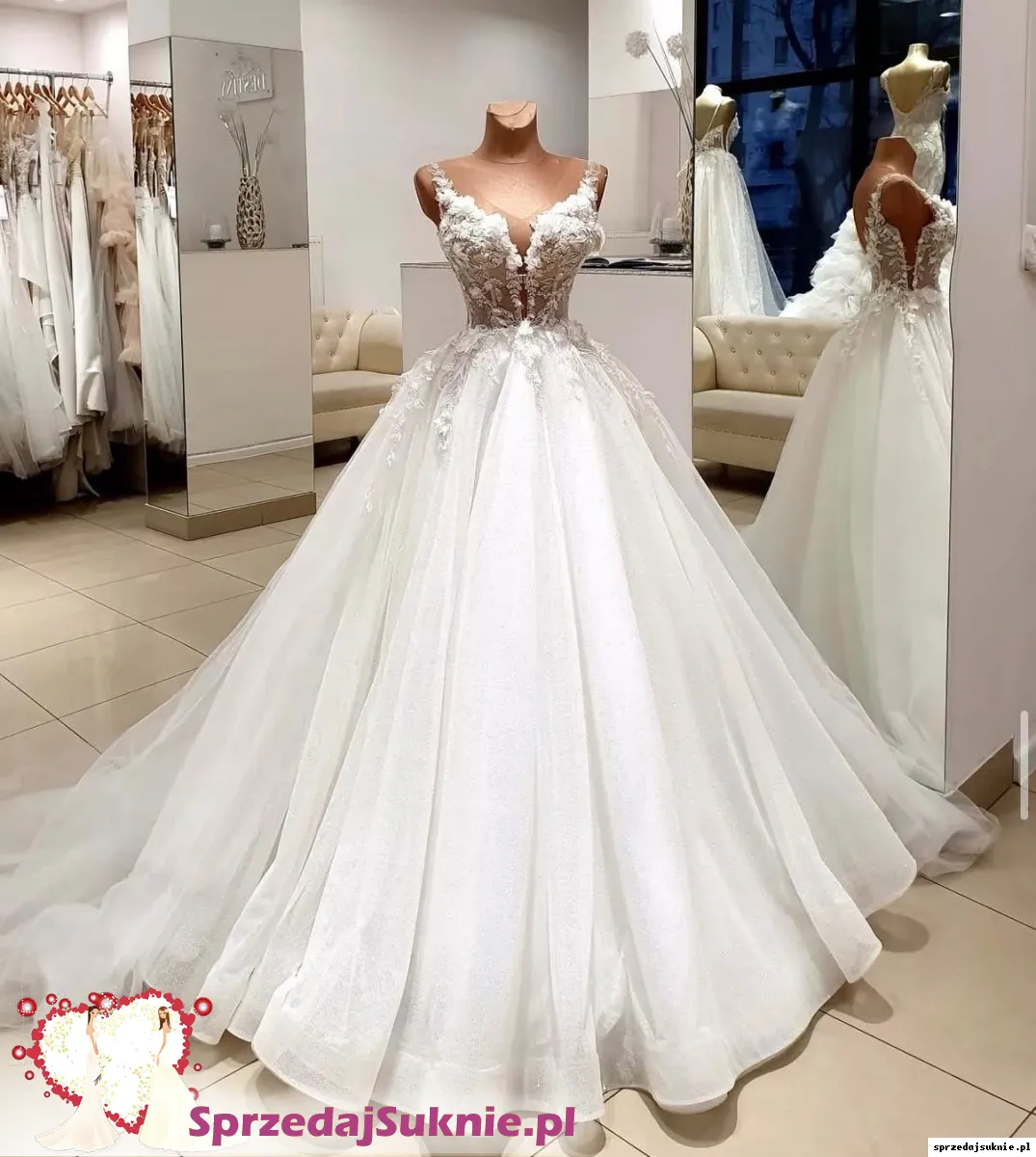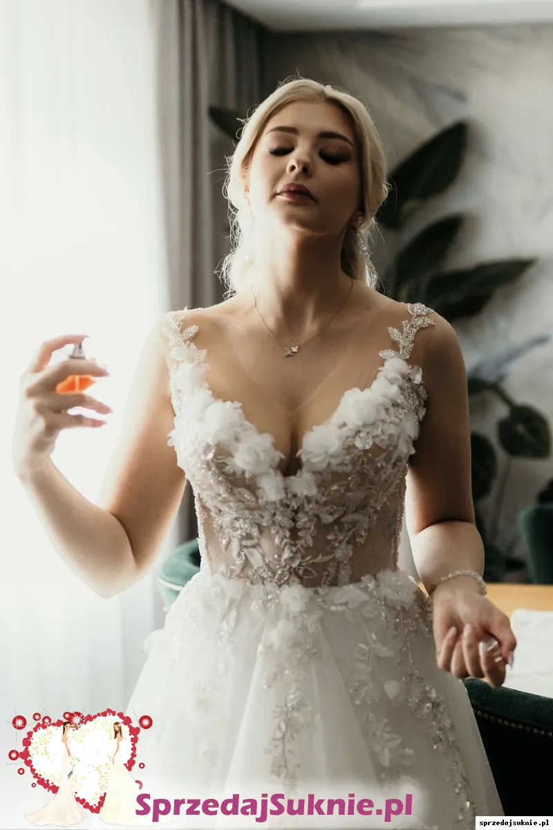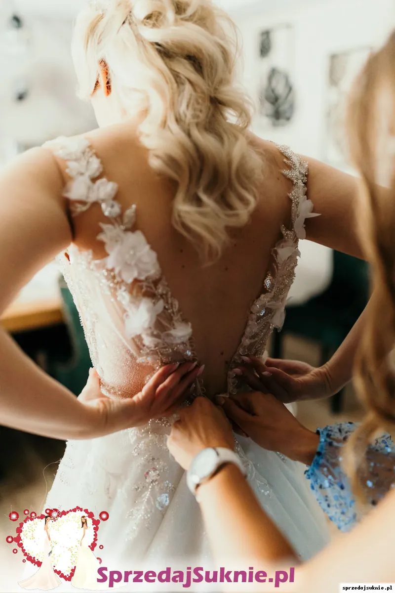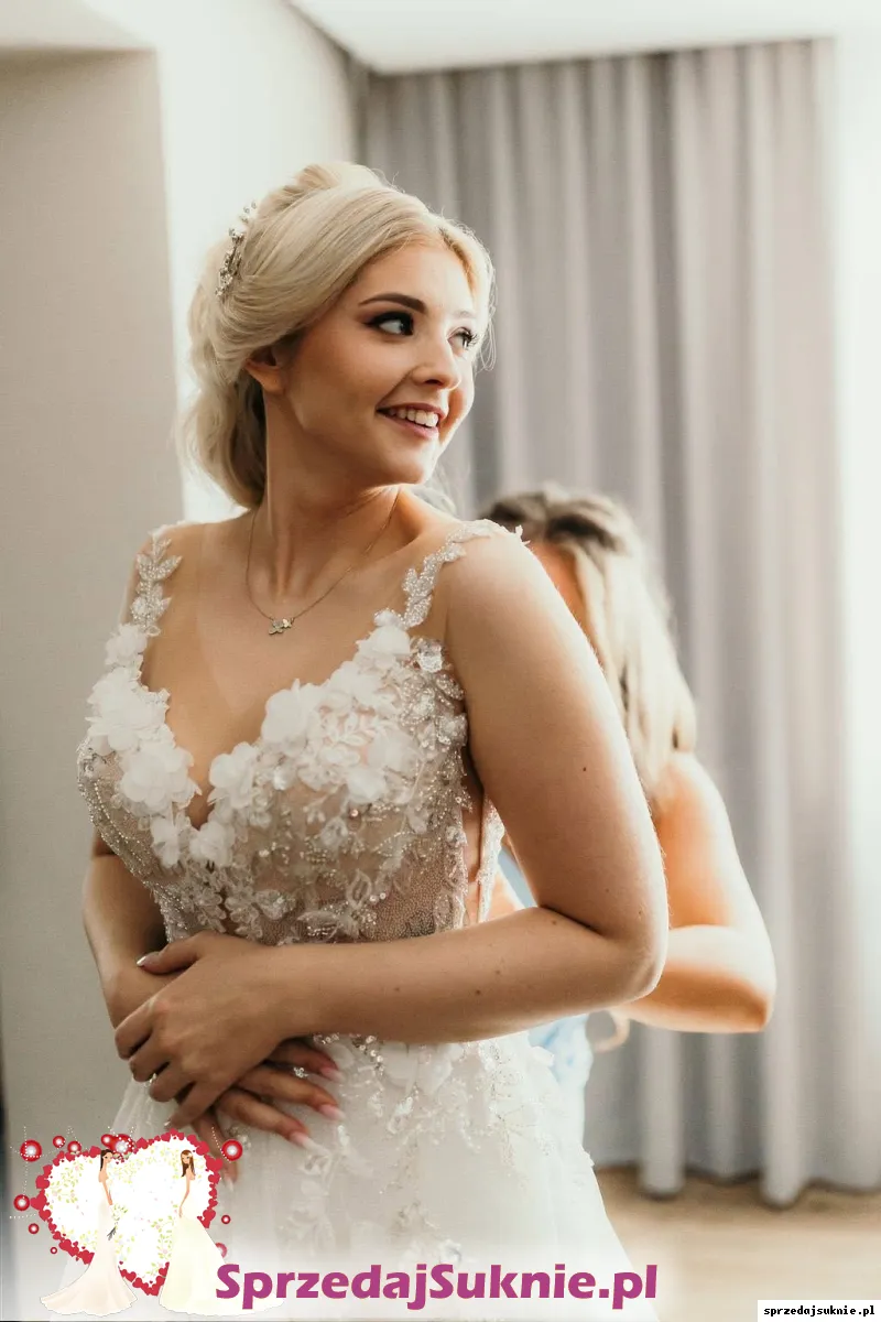 Suknia była założona tylko raz, w dniu ślubu, i jest w stanie idealnym – bez plam, zaciągnięć czy innych śladów użytkowania.