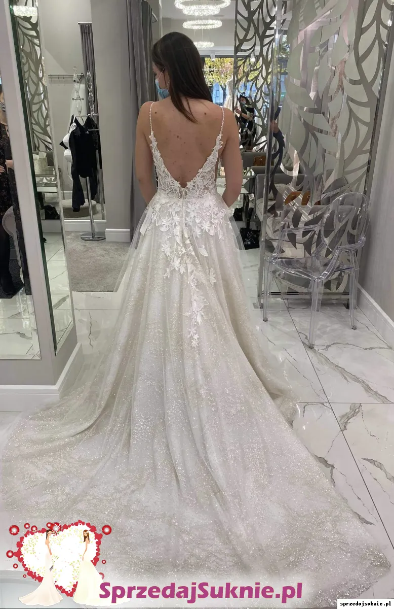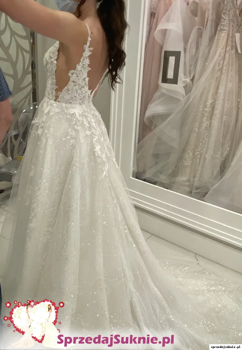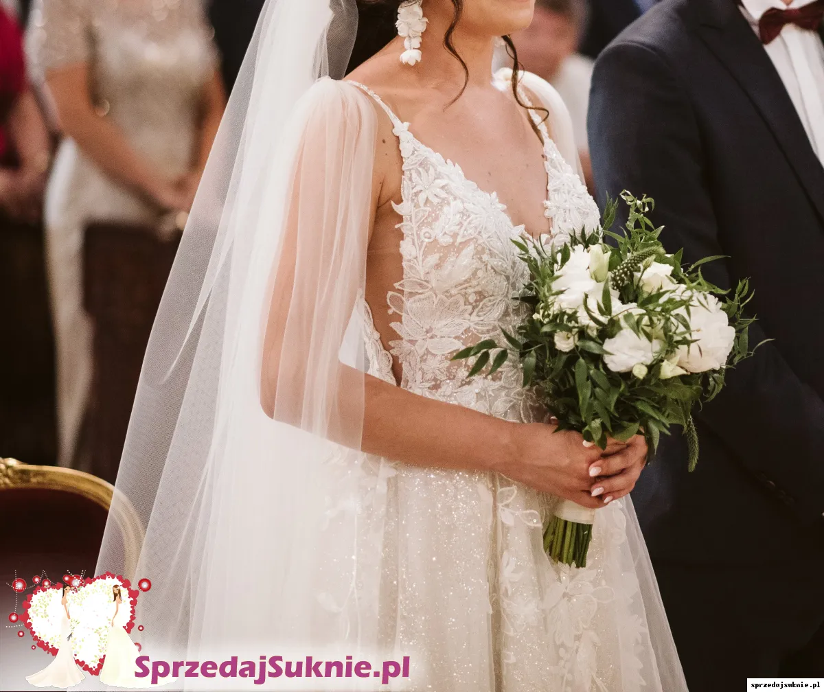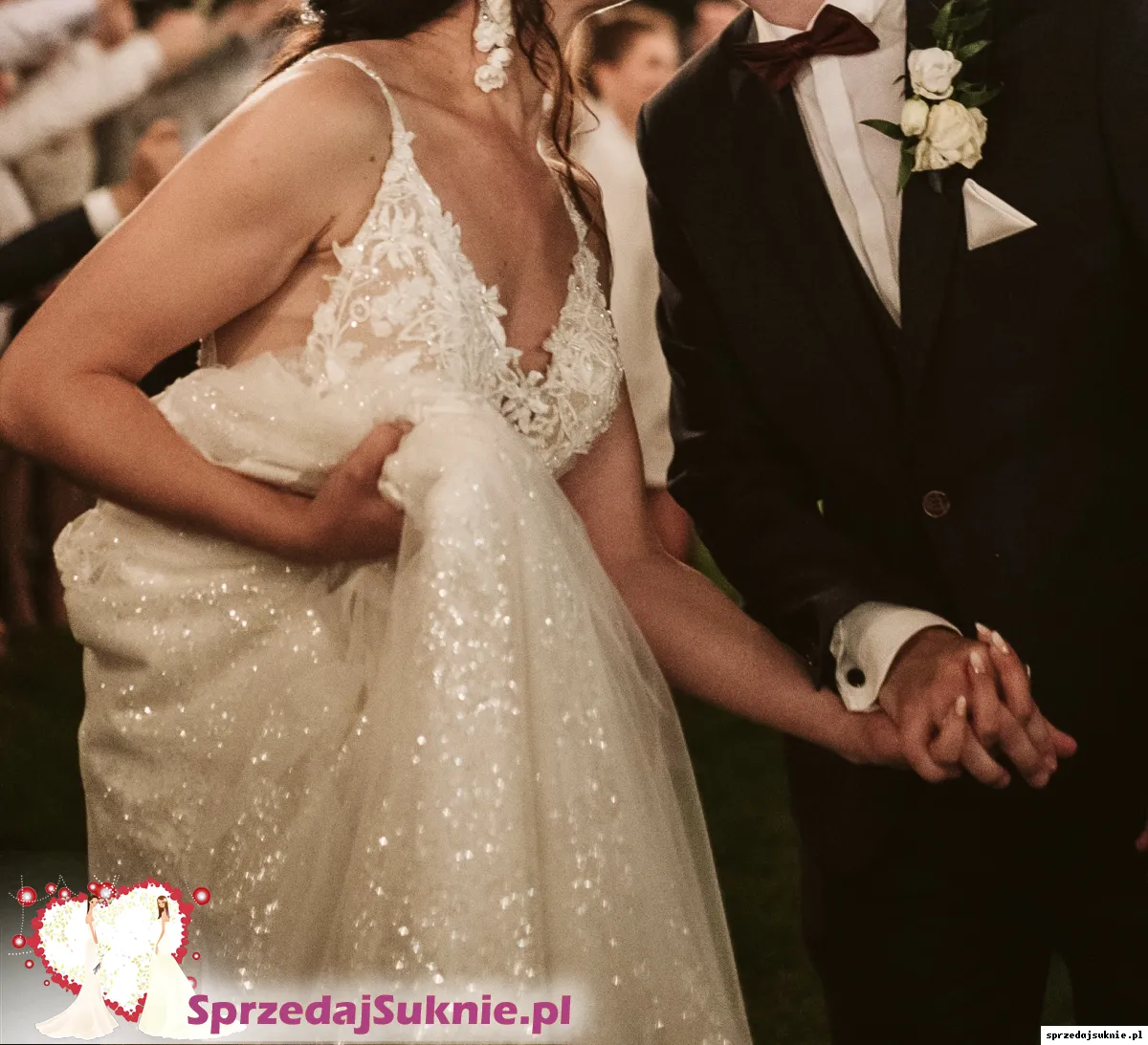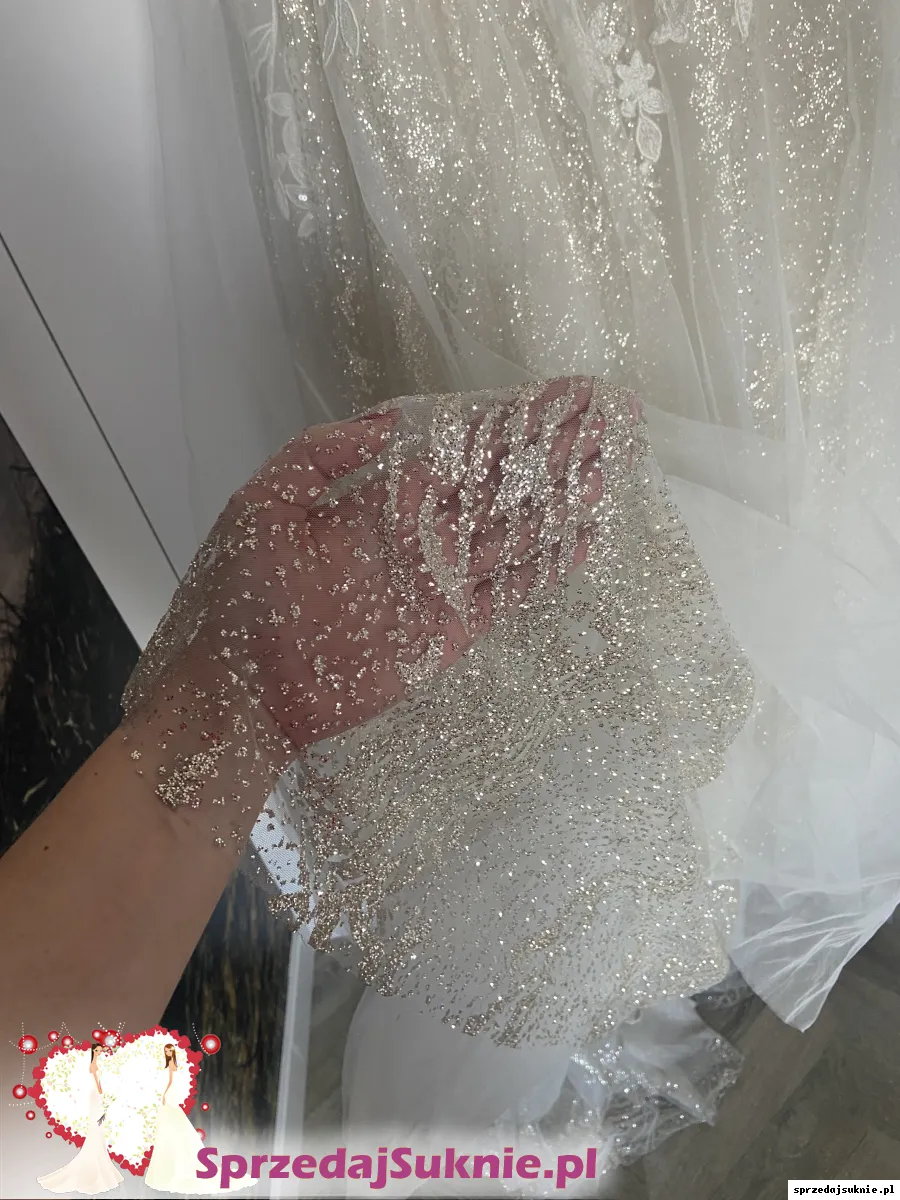 Sprzedam suknię ślubną Liretta Liberica zakupioną w salonie ślubnym Carmen w Warszawie. Suknia ślubna w kolorze ivory, posiada trzy warstwy jedną satynową dolną, drugą tiulową pokrytą brokatem, trzecią tiulową gładką. Warstwa brokatowa na żywo tworzy delikatny błyszczący efekt, na zdjęciach zaś przepięknie się mieni. Goście byli pod wrażeniem. :) Ramiączka nie są regulowane, posiadają podszycie silikonowe (nie odparza, po całej nocy nie miałam ani śladu a jednocześnie ramiączka dzięki temu nie zsuwały się). Na ramiączkach są też oczka do przyczepienia peleryny (można je odpiąć) - ja miałam w kościele pelerynę tiulową w kolorze sukni - mogę dorzucić w gratisie do sukni. U góry siateczka cielista, praktycznie niewidoczna. Wszyte są także miseczki więc sukienkę zakładamy bez biustonosza. Suknia posiada efektowny podpinany tren.