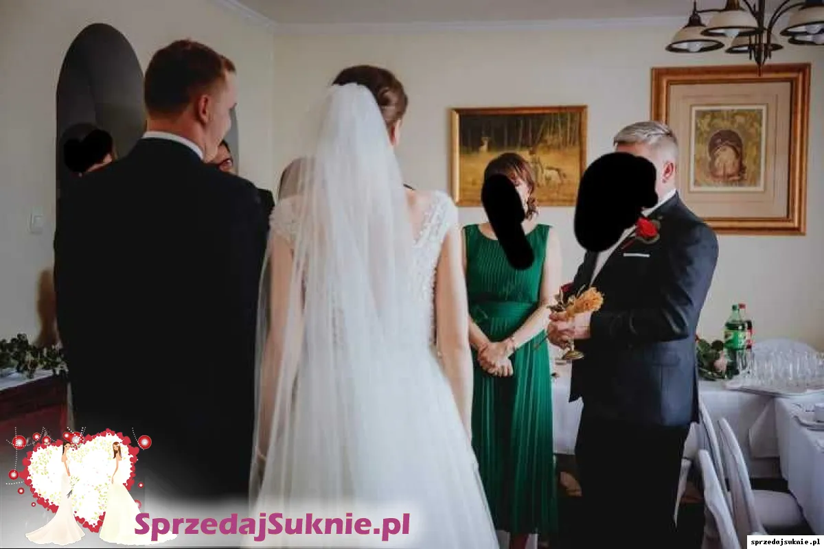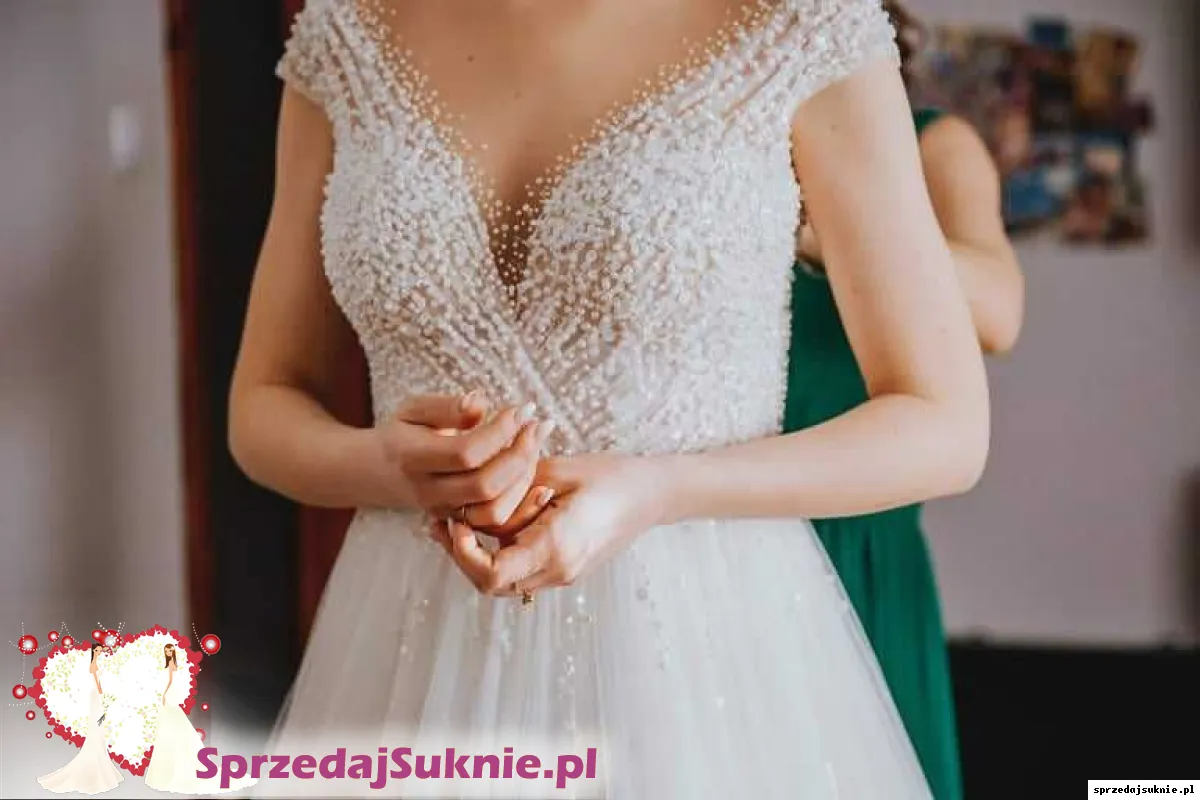 W zestawie welon widoczny na zdjęciach oraz klosz pod suknie. Kolor - kość słoniowa. Suknia wyszywana perełkami.
