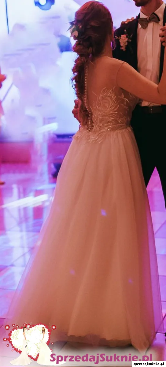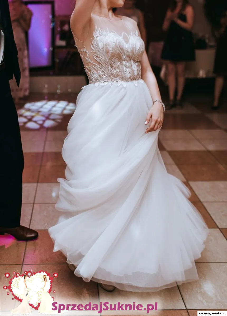 Góra sukni zrobiona jest z delikatnej cielistej siateczki dopasowanej pod barwę cery i wykończona oryginalną koronką przypominającą pawie pióra z dodatkiem złotej nitki. Uroku sukni dodają pięknie wykończone plecy, których kształt ładnie podkreśla talię.