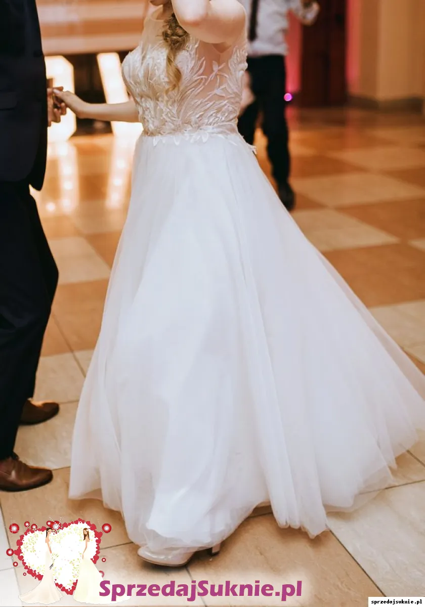 Dół sukni zrobiony jest z delikatnego muślinu i tiulu w kolorze ivory.