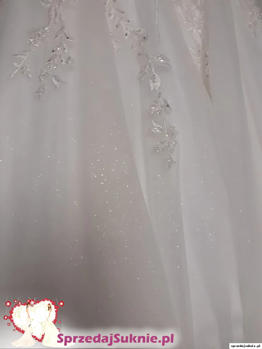 Biała nowa suknia ślubna wykonana z miękkiego tiulu zakupiona w salonie Allure w Białymstoku. Miseczki wbudowane, siateczka beżowa w dekoldzie, dół sukni z pięknym brokatem, który pięknie się mieni w świetle i podkreśla wyjątkowość sukni. Biust 83 cm; talia 65 cm; biodra 94 cm; wzrost 165 cm