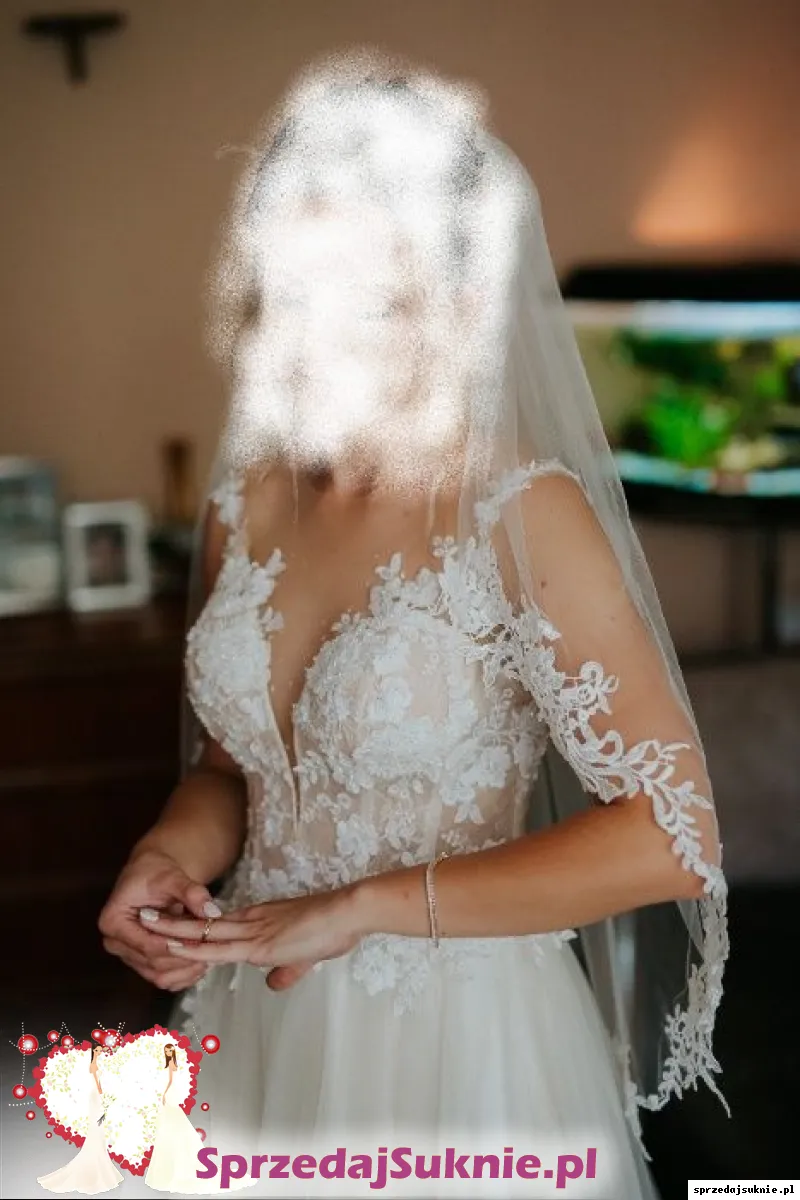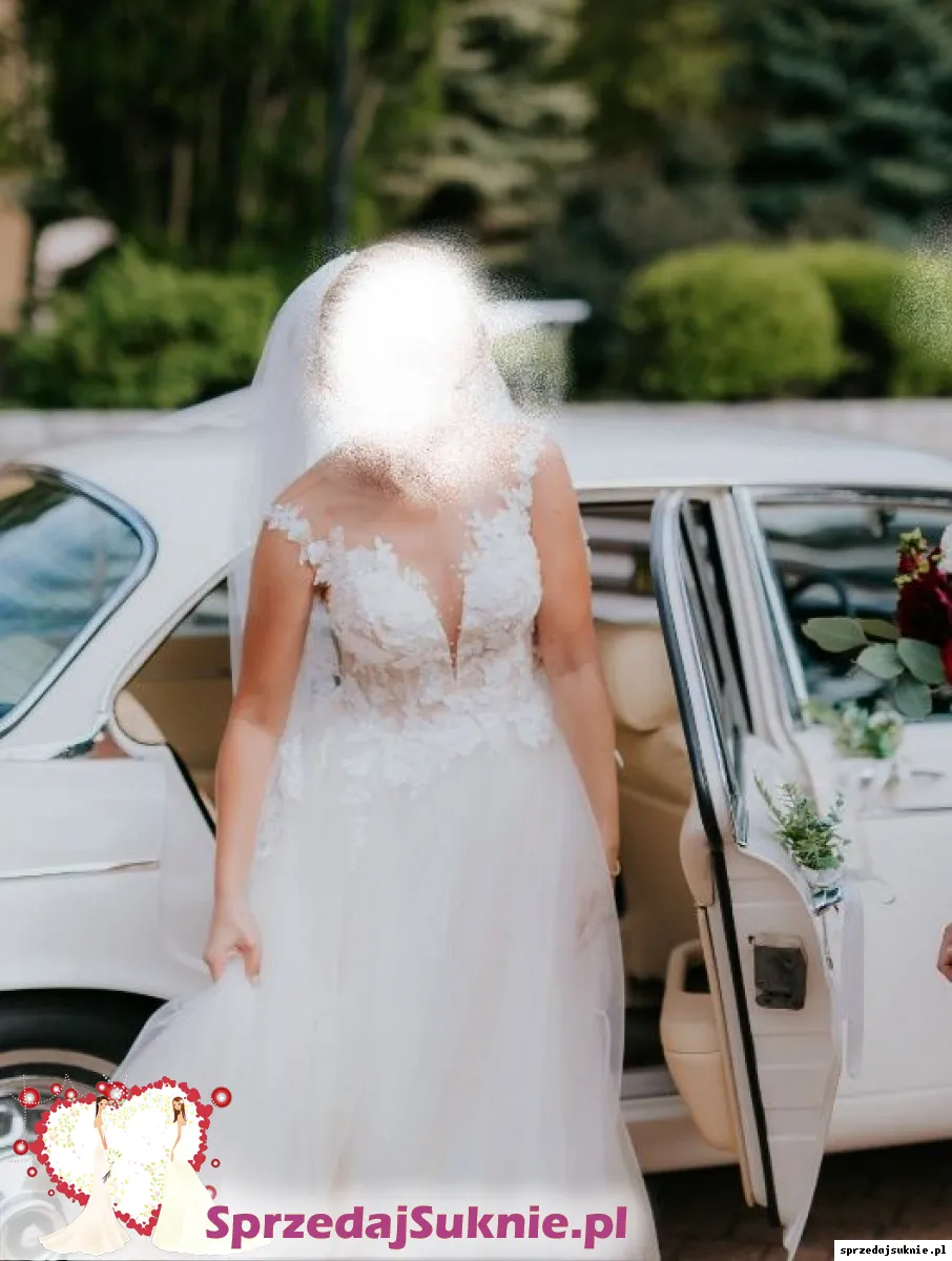 Góra sukni jest bogato zdobiona z dużym dekoltem, dół z tiulu, lekko się mieni. Suknia ma wbudowane miseczki stanika. Wzrost 164cm + obcas 6 cm, obwód biustu 91 cm, obwód talii 69 cm. Do sukni dołączam piękny welon z ozdobnymi brzegami.