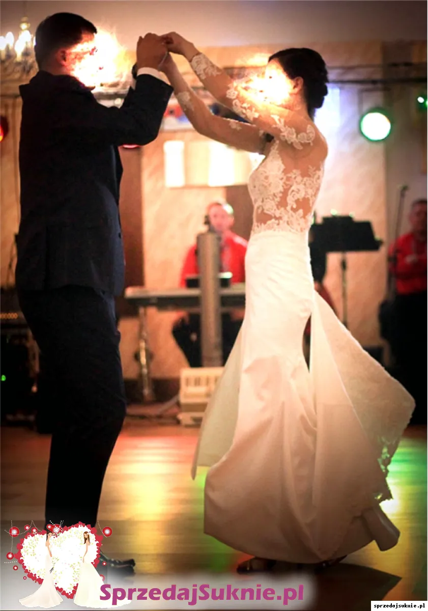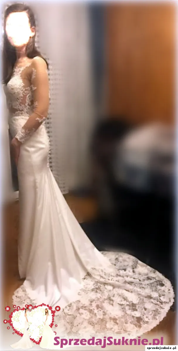 - suknia posiada lekki tren wykonany z koronki, zapinany na dowolnej wysokości przez wzgląd na szereg guzików z tyłu od szyi, aż do połowy uda