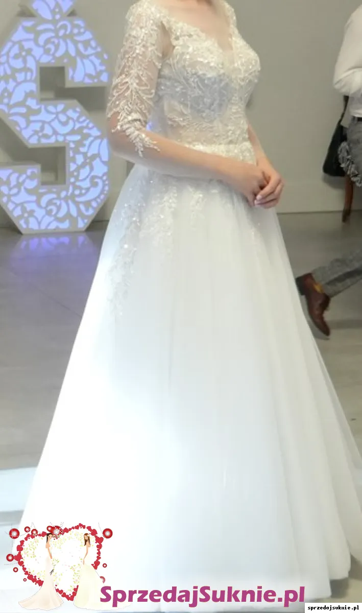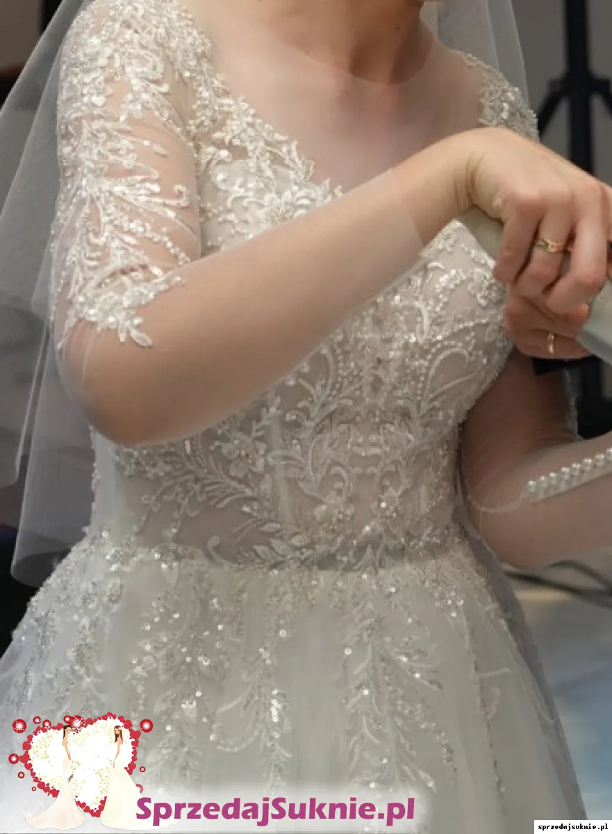 Sprzedam moja suknię ślubną, z kolekcji 2024. Suknia jest pięknie bogato zdobiona. Na plecach ma piękne zdobienia, ma długi rękawek z siateczki i zdobienia na bokach. Dekolt także jest na cienkiej siateczce dzięki czemu wszystko wygląda estetycznie i pięknie. Suknia ma taki a'la gorset który jest wiązany w pasie - co daje możliwość regulacji i dopasowania do sylwetki. Dół sukni ma delikatny brokat na drugiej warstwie dzięki czemu w sztucznym świetle suknia pięknie się mieni. Ja miałam pod spodem halkę z kołem przez co suknia na zdjęciach jest bardziej rozkloszowana, bez koła będzie to typowy krój A. Zapraszam do kontaktu - suknia zuskała pochwały od niejednego gościa.