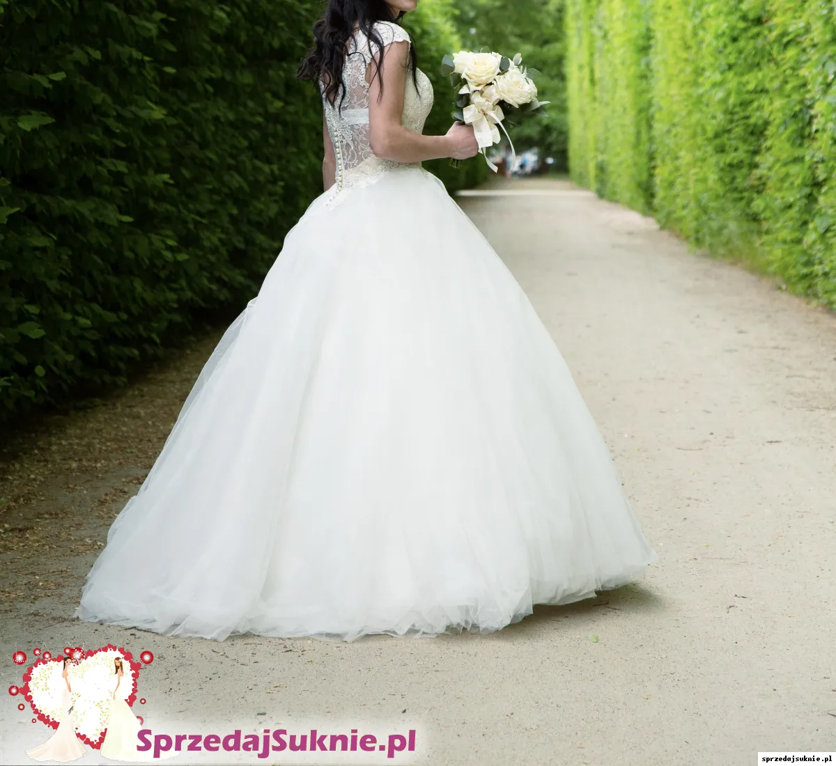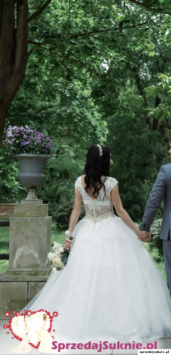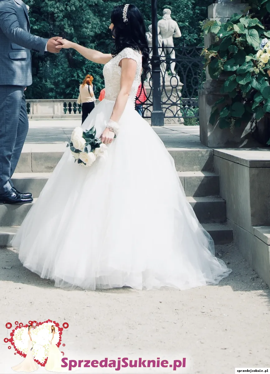 Mój wzrost 159cm. Miałam obcas 5 cm. Sukienka jest bardzo wygodna i elegancka, zapinana z tyłu na guziczki. Bardzo dobrze się w niej czułam, a suknia zebrała mnóstwo komplementów. Założona tylko raz ślub i sesje zdjęciową. Możliwość przymiarki w Piastowie.