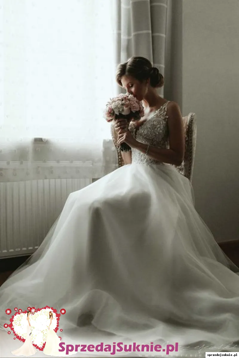 Góra sukni zrobiona jest z ręcznie wykrajanej koronki, która posiada delikatne koraliki mieniące się w słońcu. Wycięcie z tyłu pięknie eksponuje plecy. Suknia posiada wiązany gorset, który umożliwia idealne dopasowanie do sylwetki.