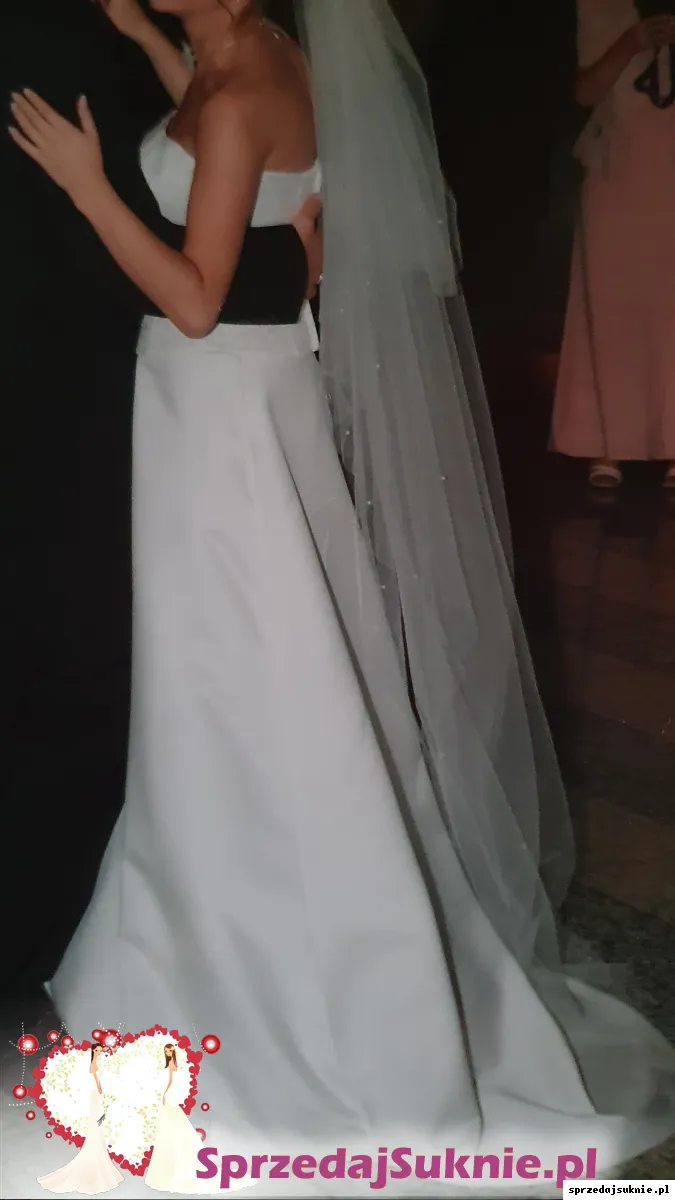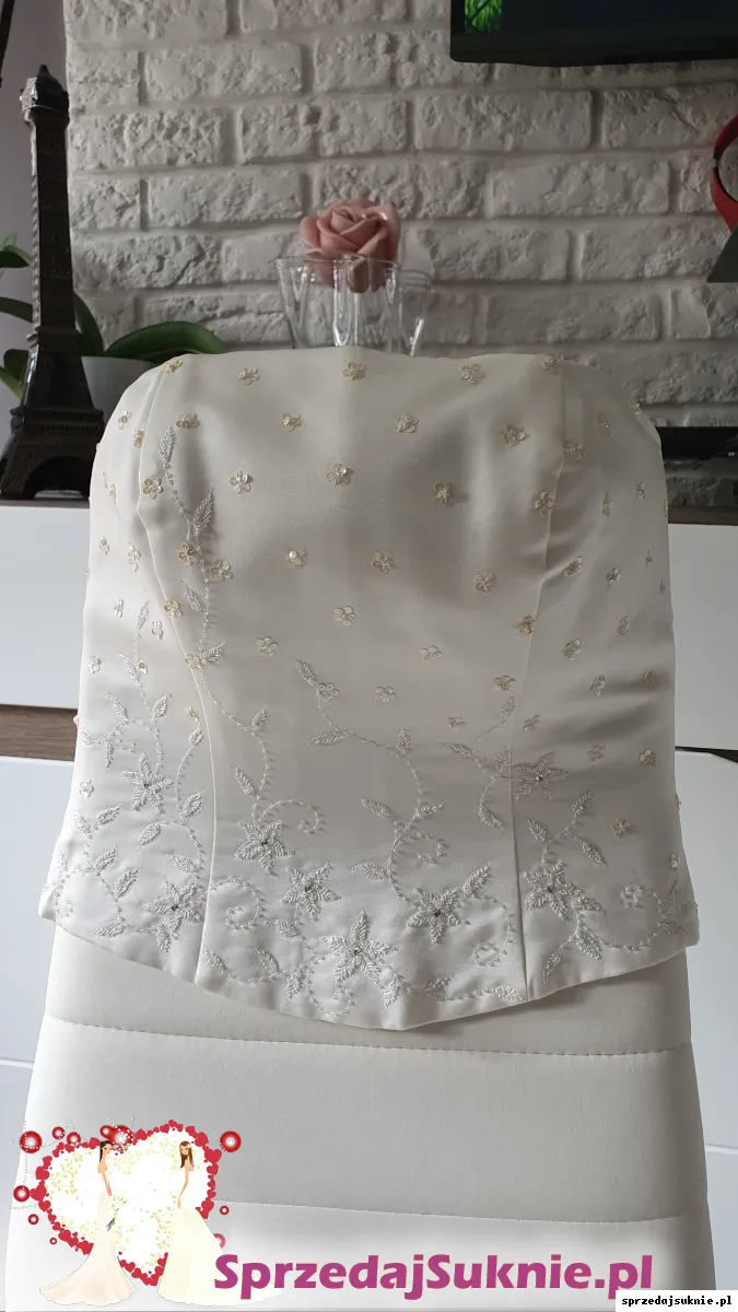 W komplecie również welon bez obszycia z perełkami i nieużywany szal haftowany motywem jak na gorsecie (zdjęcia na priv), gładkie długie rękawiczki oraz ozdoba do włosów i na szyję z tej samej serii.