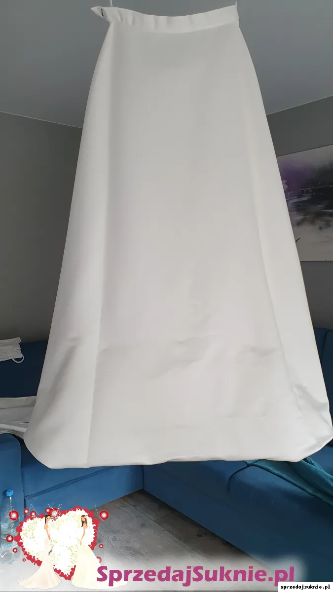 Spódnica gładka w kształcie litery A z niewielkim trenem widocznym na jednym ze zdjęć, podpinanym od spodu, co przedstawia inne zdjęcie. Spódnica posiada podszewkę, by lepiej się prezentowała potrzebna jest halka-wypożyczałam taką w salonie, więc nie posiadam na sprzedaż.