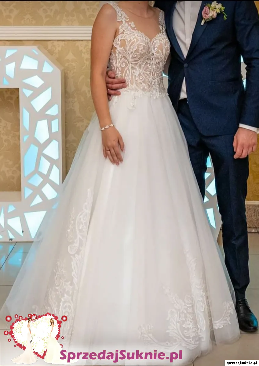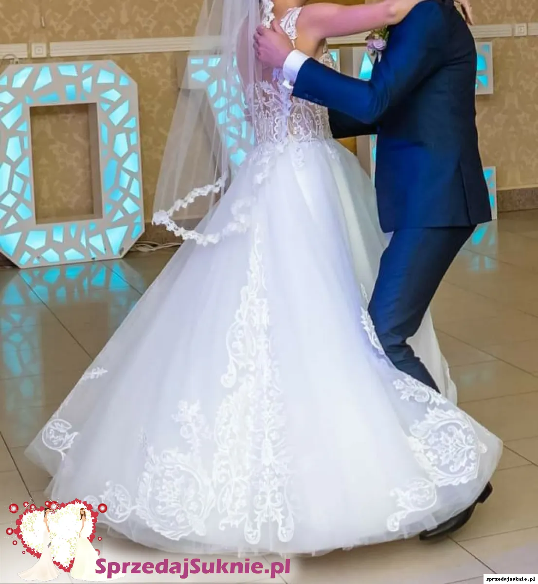 Kolor ivory r. 36 na wzrost 167 + 8cm obcas. Wspaniale dopasowuje się do sylwetki dzięki części gorsetowej. Bogato zdobiona na siateczce (połyskujące, odstające koraliczki), zapinana na guziczki i suwak. Posiada wszyte miseczki. Do sukni dołączona jest halka z kołem, dzięki czemu jest ona bardzo wygodna, nic nie uwiera, nie zniszczyła się w trakcie użytkowania. Pięknie prezentuje się w tańcu. Suknia po profesjonalnym praniu w pralni. Welon i pokrowiec na suwak gratis. Możliwość przymiarki w okolicach Lublina/Chełma.