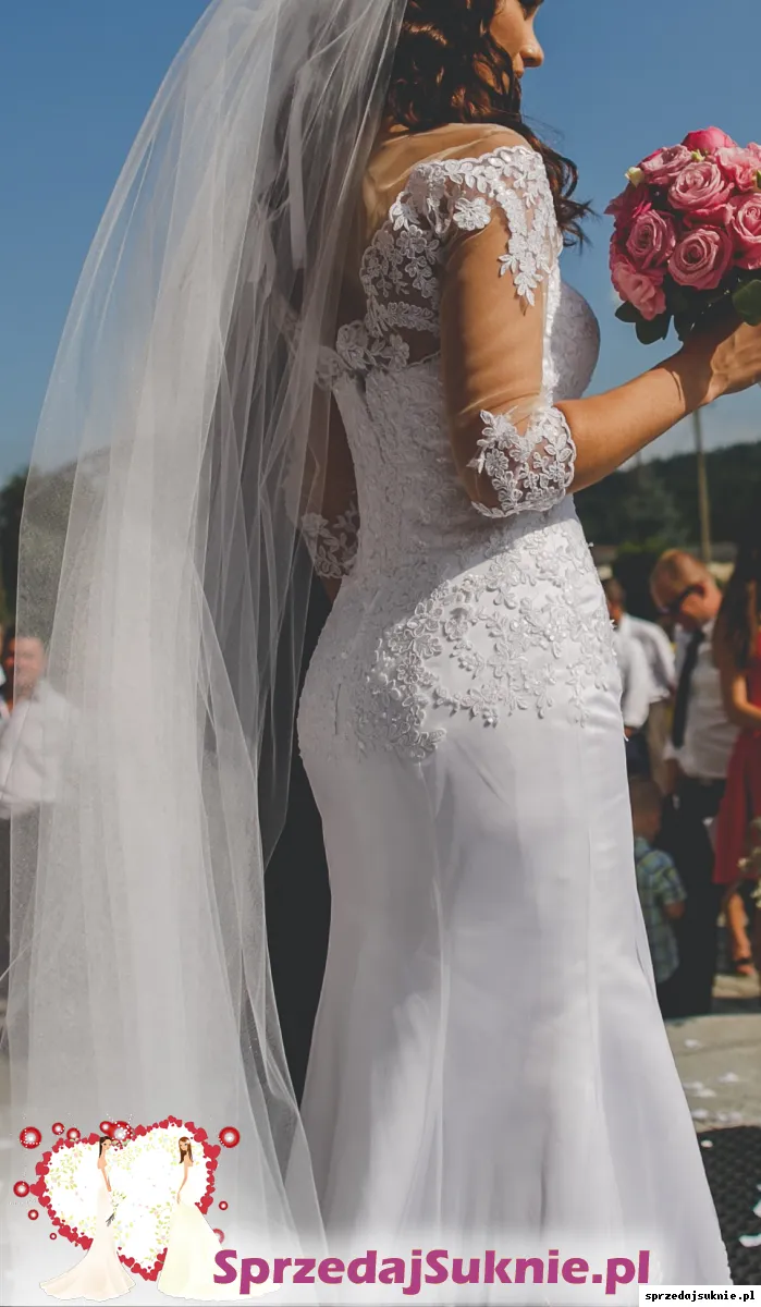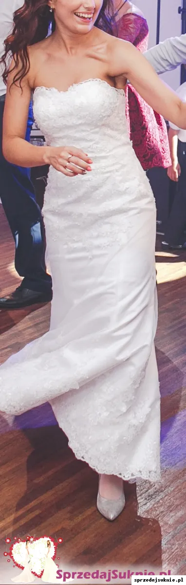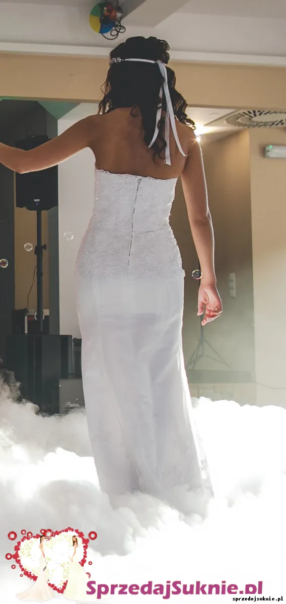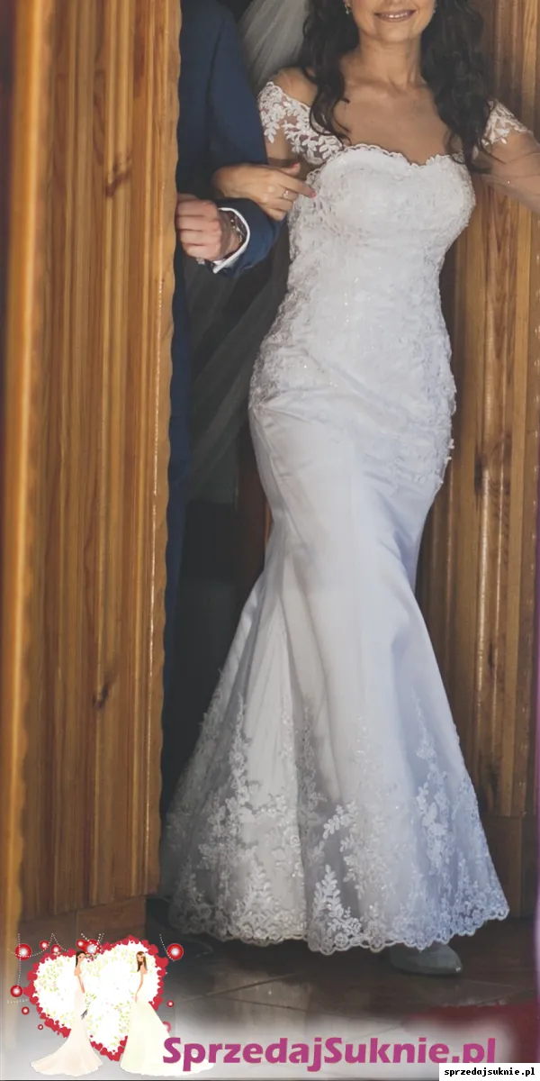 Mam do sprzedania suknie slubna typu rybka/ syrenka. Suknia szyta jest na wysokosc 160 plus 8 cm obcas. Jest bez trenu, dolem obszyta bardzo ladna koronka. Z tylu wszyty zamek, plus guzik zeby mocno trzymalo sukienke. Dodatkowo wszyta jest gumka w pasie, dzieki czemu sukienka nie spada, nie trzeba jej ciagle podciagac.