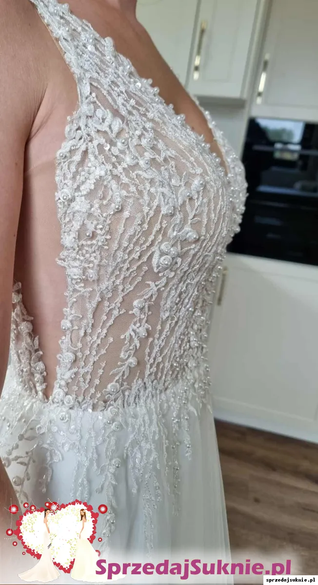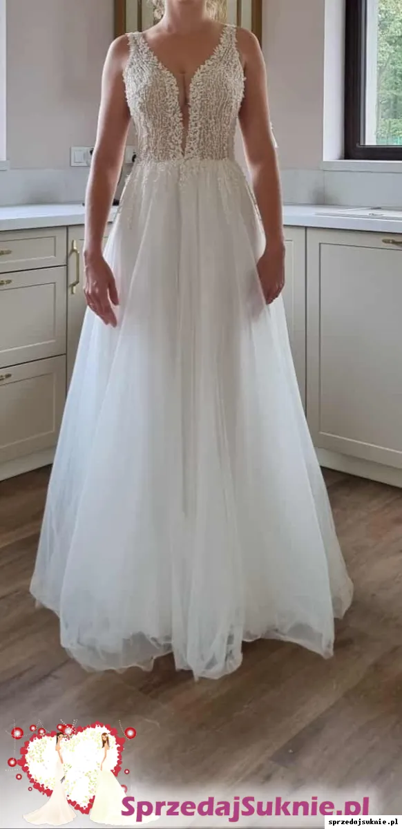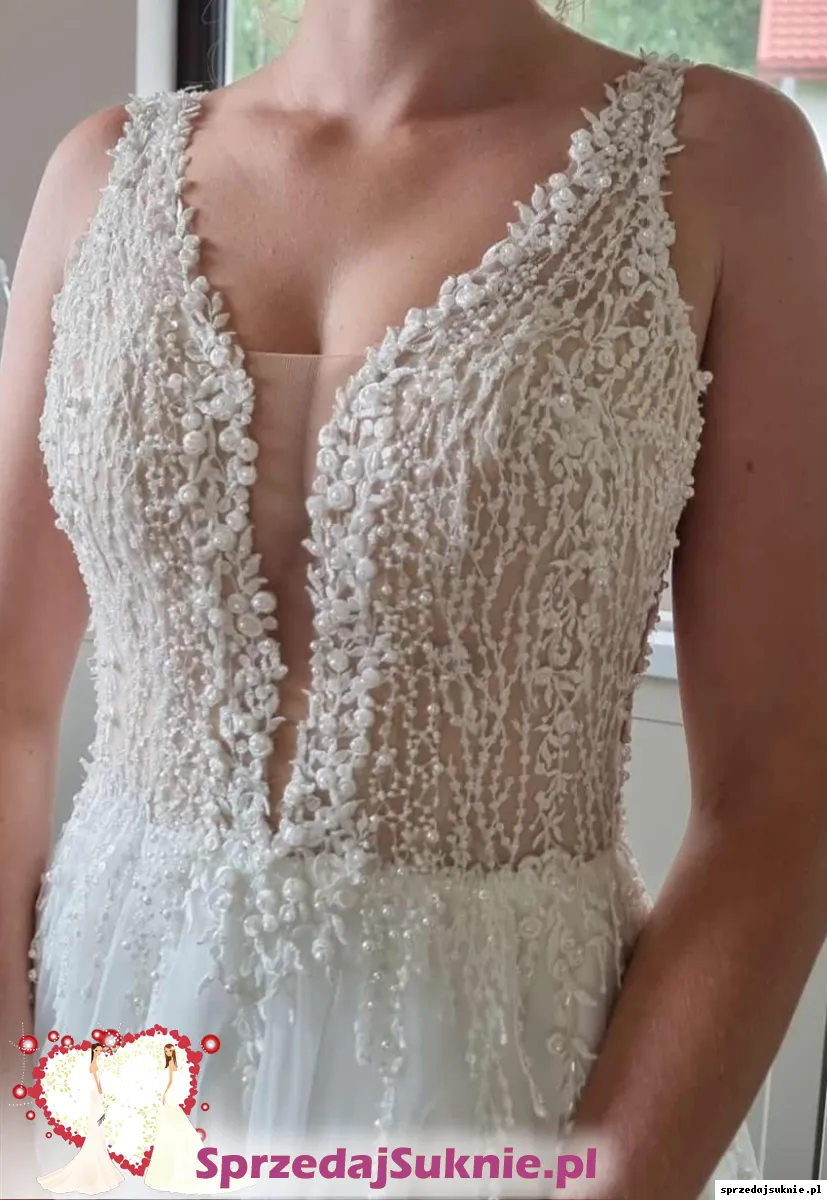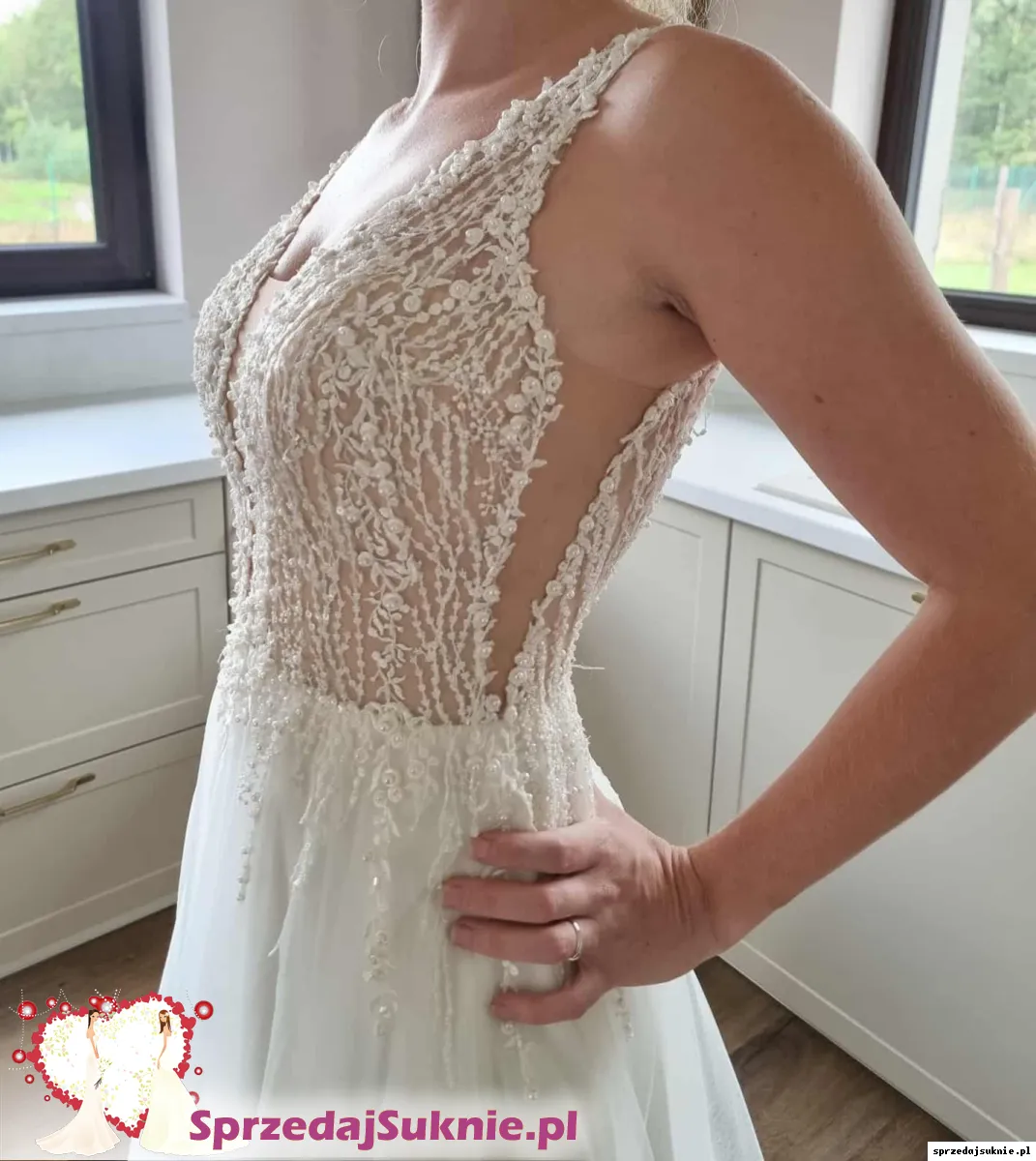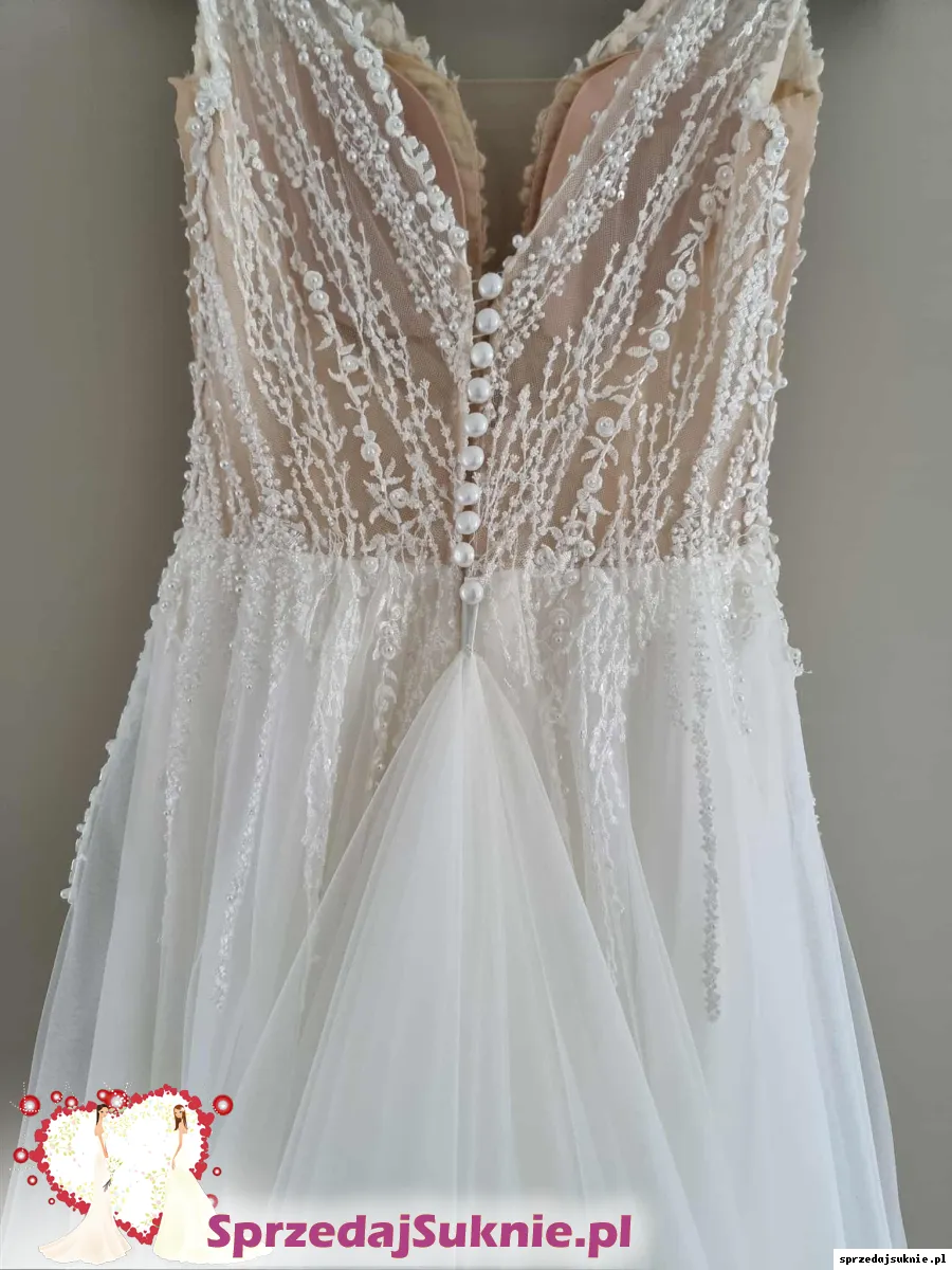Sprzedam suknie ślubną w stanie bardzo dobrym/ dobrym. Suknia nie ma plam, dziur. Suknia posiada tren który po ślubie był zmodyfikowany u krawcowej ponieważ był zadarty. Obecnie można go również ładnie zaprezentować, jest on podpinany na ostatni guziczek co widać na zdjęciu. Podpięty idealnie wpasowuje się w suknie i jest niezauważalny, jest to bardzo pomocne przy tańcu.