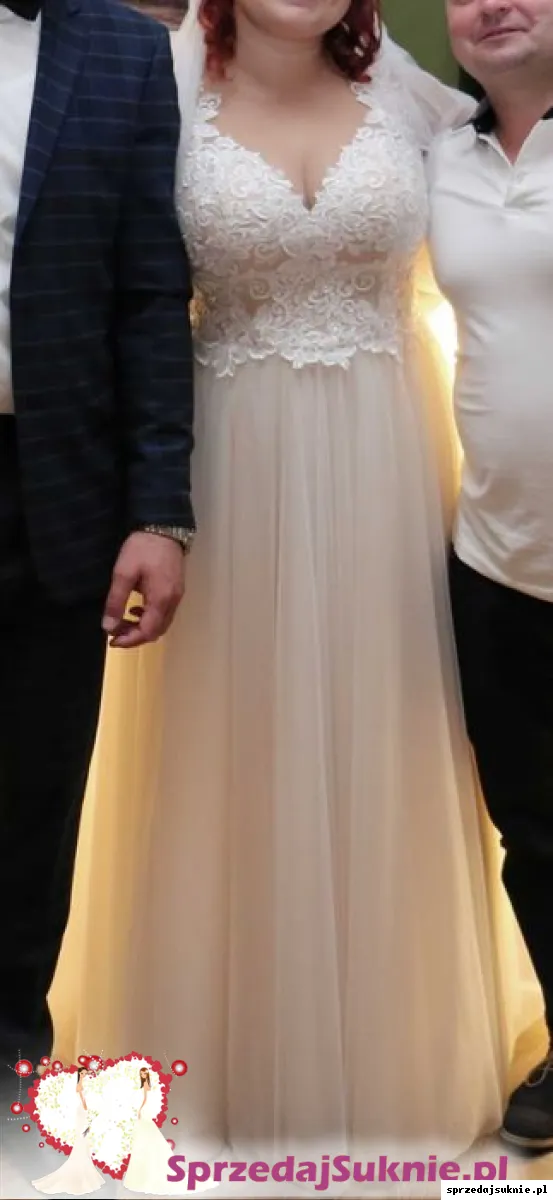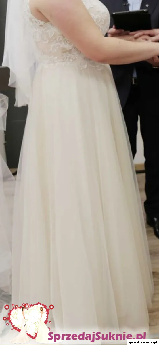 Sprzedam suknie ślubna w kolorze ecru z dołem błyszczącym brokatowym, góra zdobiona jest koronką. Z tyłu wyszyte guziczki z kryształków. Suknia była szyta na miarę w salonie sukien ślubnych White Kłodzko.