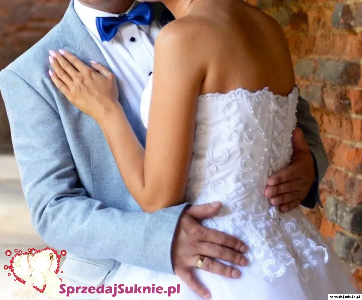 Suknia śnieżnobiała, gorset zdobiony sznurowany z tyłu.